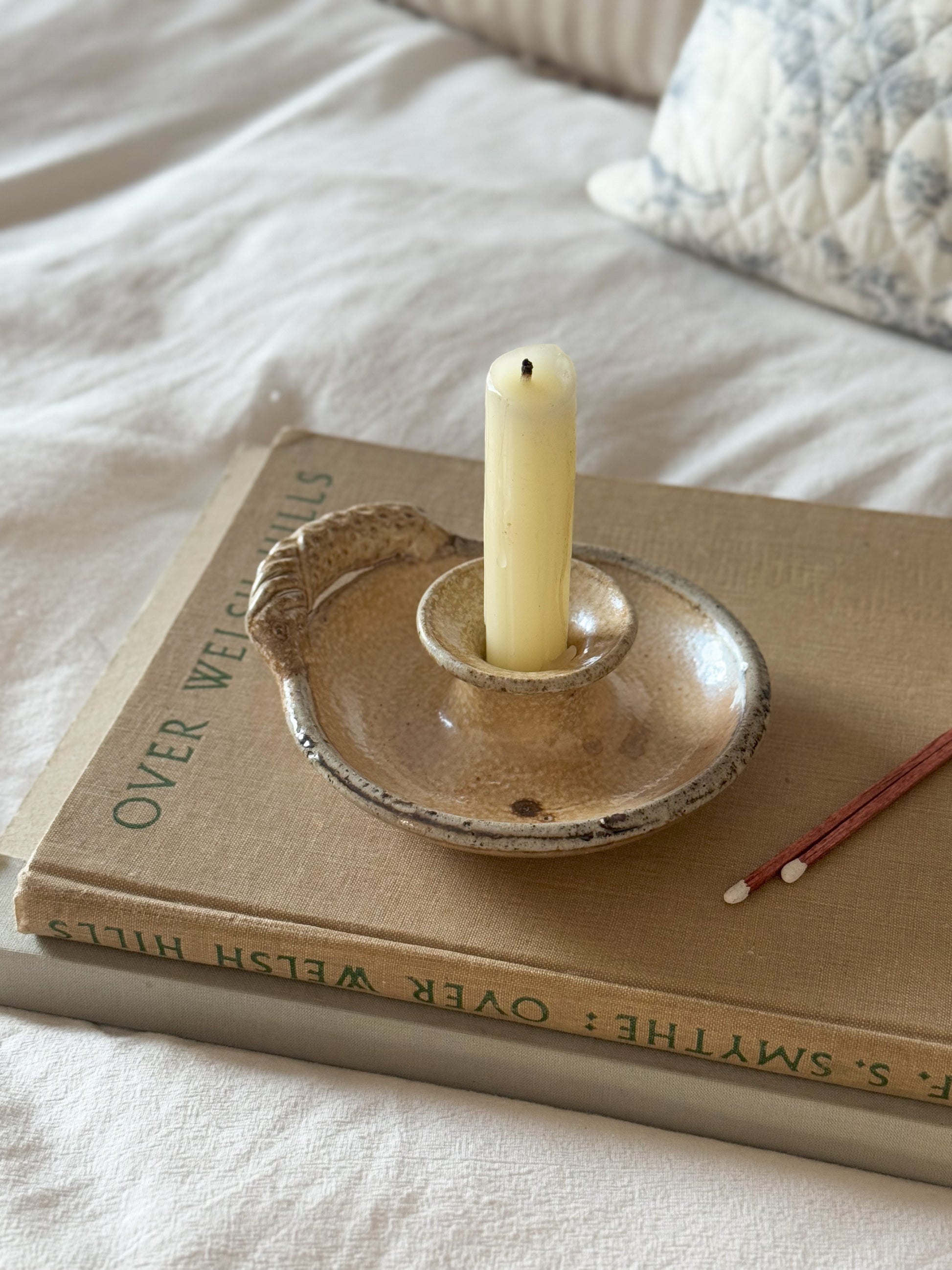 A beautiful handmade French studio pottery candle holder with a gorgeous lustre mottled beige and grey glaze with a hint of peach running through it.