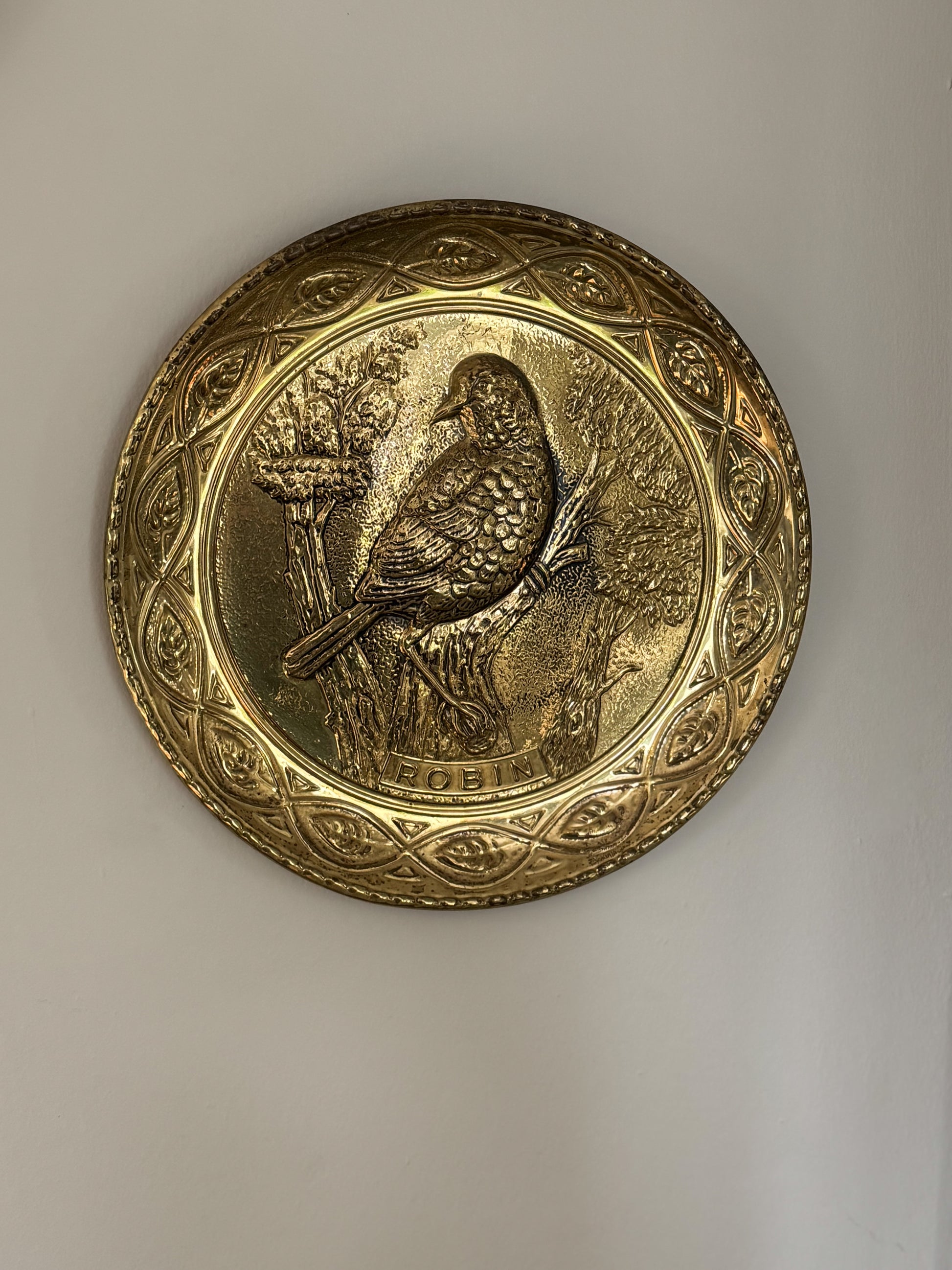 A beautifully detailed vintage hammered brass wall plate featuring a sweet little robin perched on a winter branch. Light in weight but full of texture, this piece has been beautifully hand-shaped, you can see and feel the gentle hammer marks that give it depth and character.