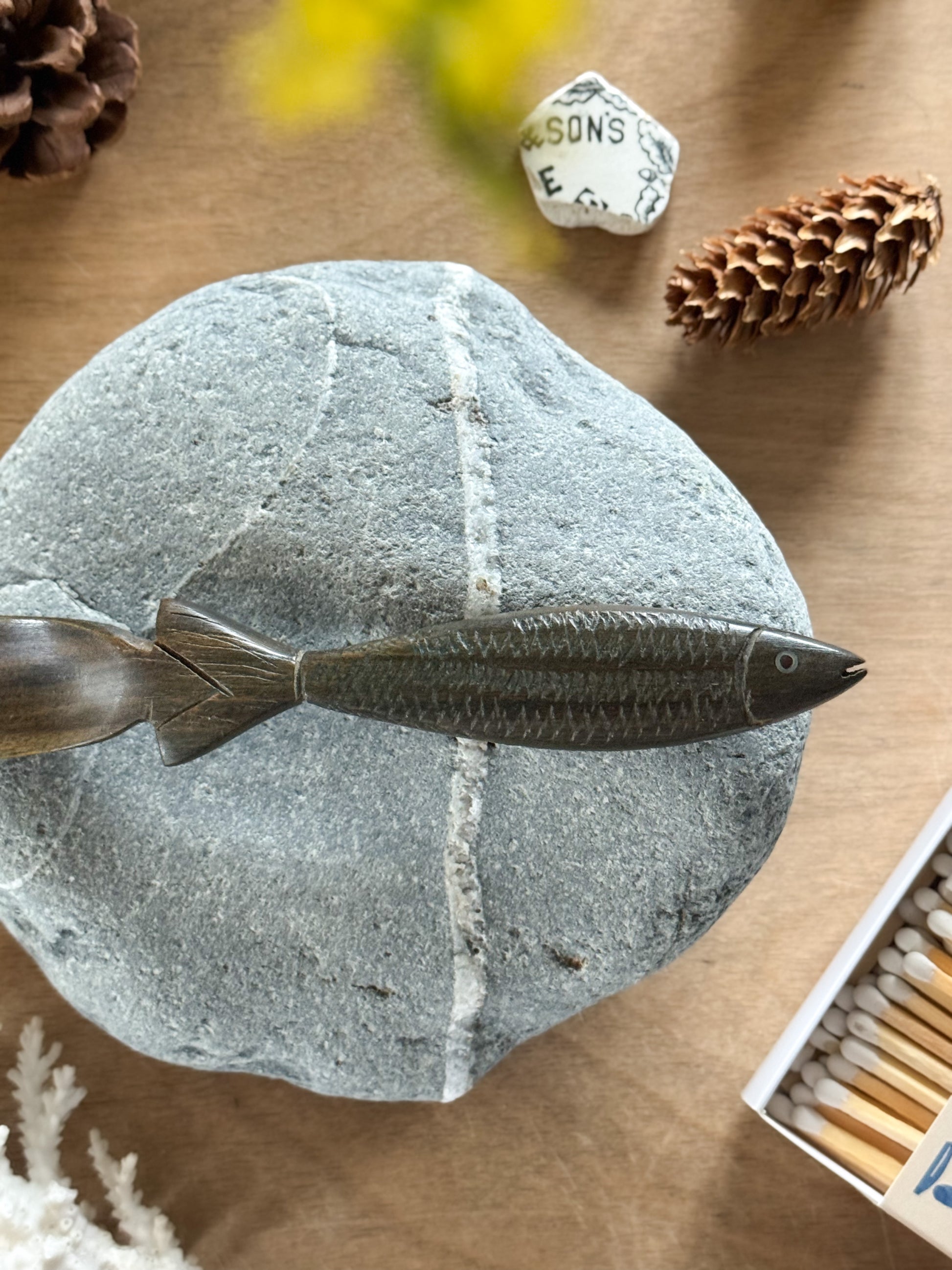 A beautifully hand-carved wooden shoehorn in the shape of a fish, a piece full of quiet charm and craftsmanship. Likely mid-20th century, it has been lovingly shaped from solid wood, with fine detailing along the scales and fins that give it a wonderfully tactile quality.