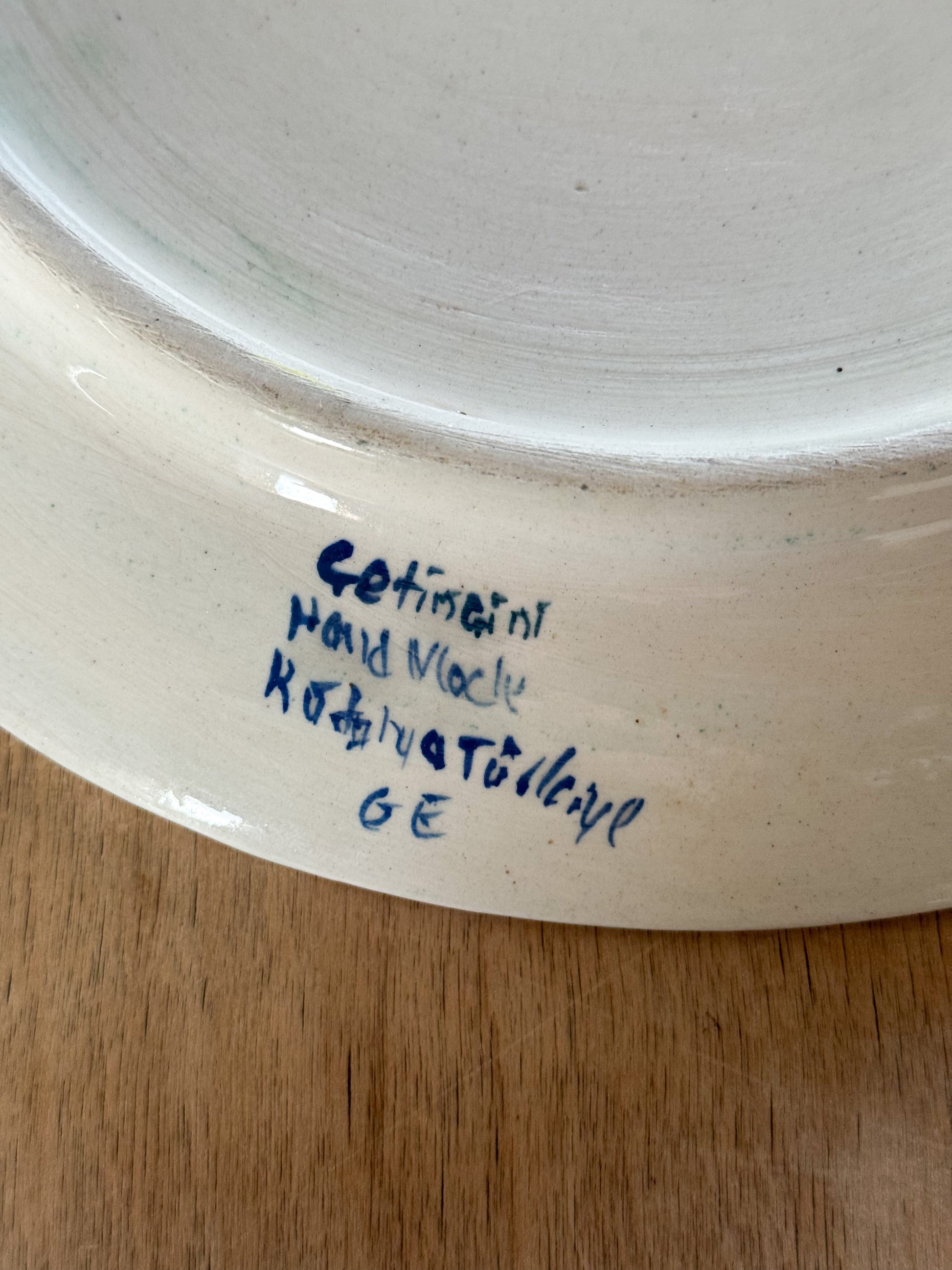 The reverse bears a handwritten maker’s mark, indicating it was handmade and painted by an individual potter, likely of Eastern European folk pottery tradition.