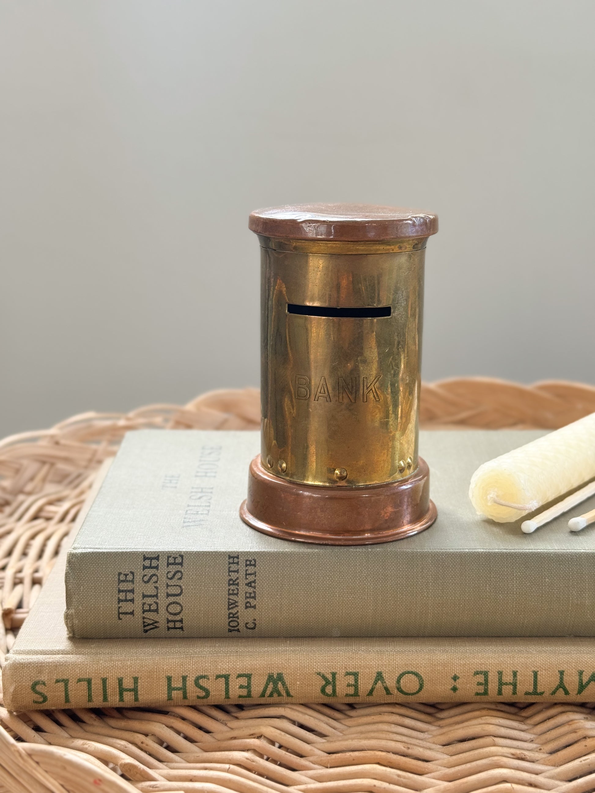 A charming vintage handmade money bank, crafted from copper and brass in the form of a traditional postbox. With its cylindrical body and the word BANK neatly stamped to the front, this little piece carries both utility and charm, once used to squirrel away coins and savings, now just as lovely as a decorative accent.