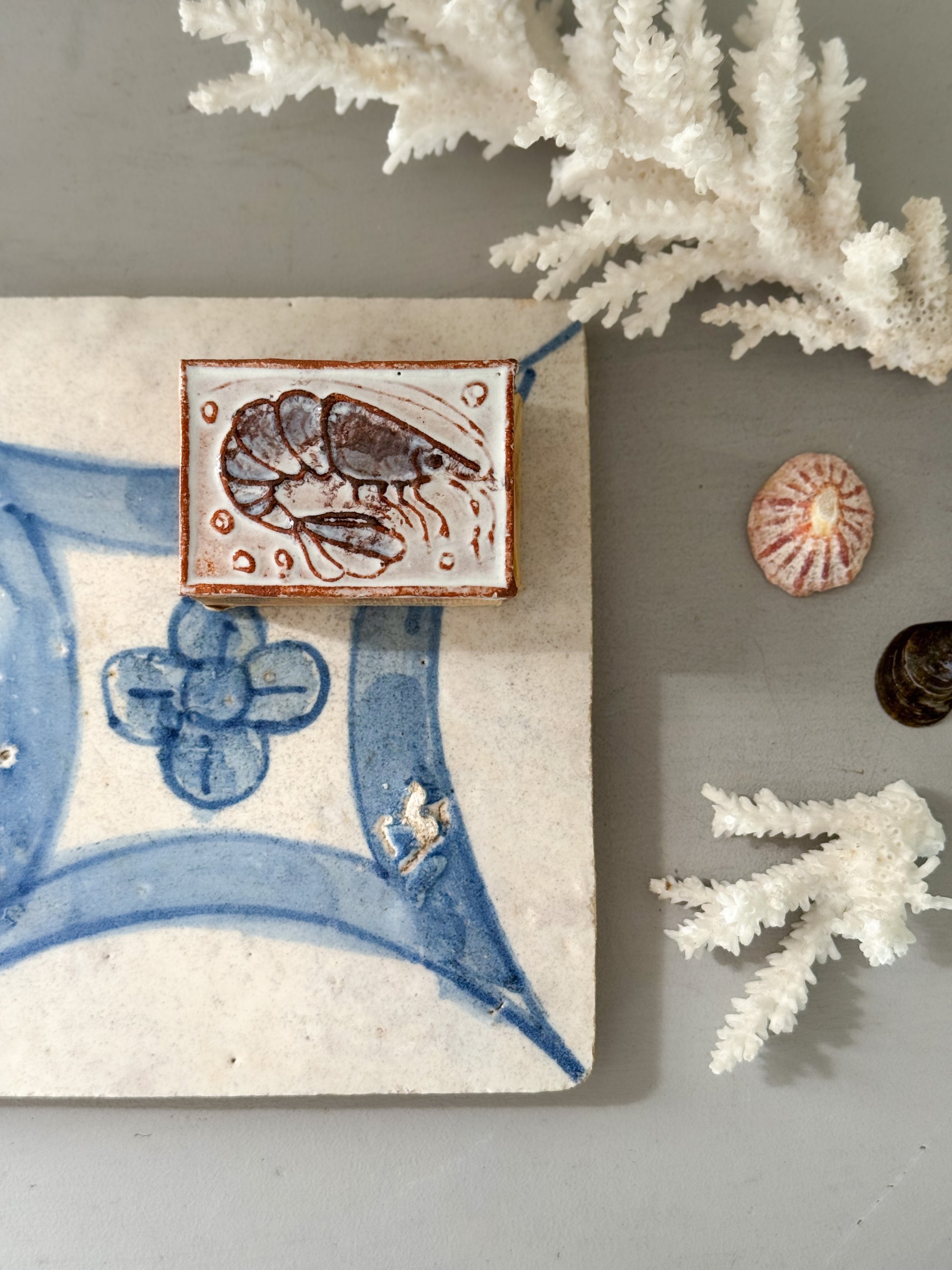Vintage Handmade Folk Art Slipware Matchbox – Prawn Motif