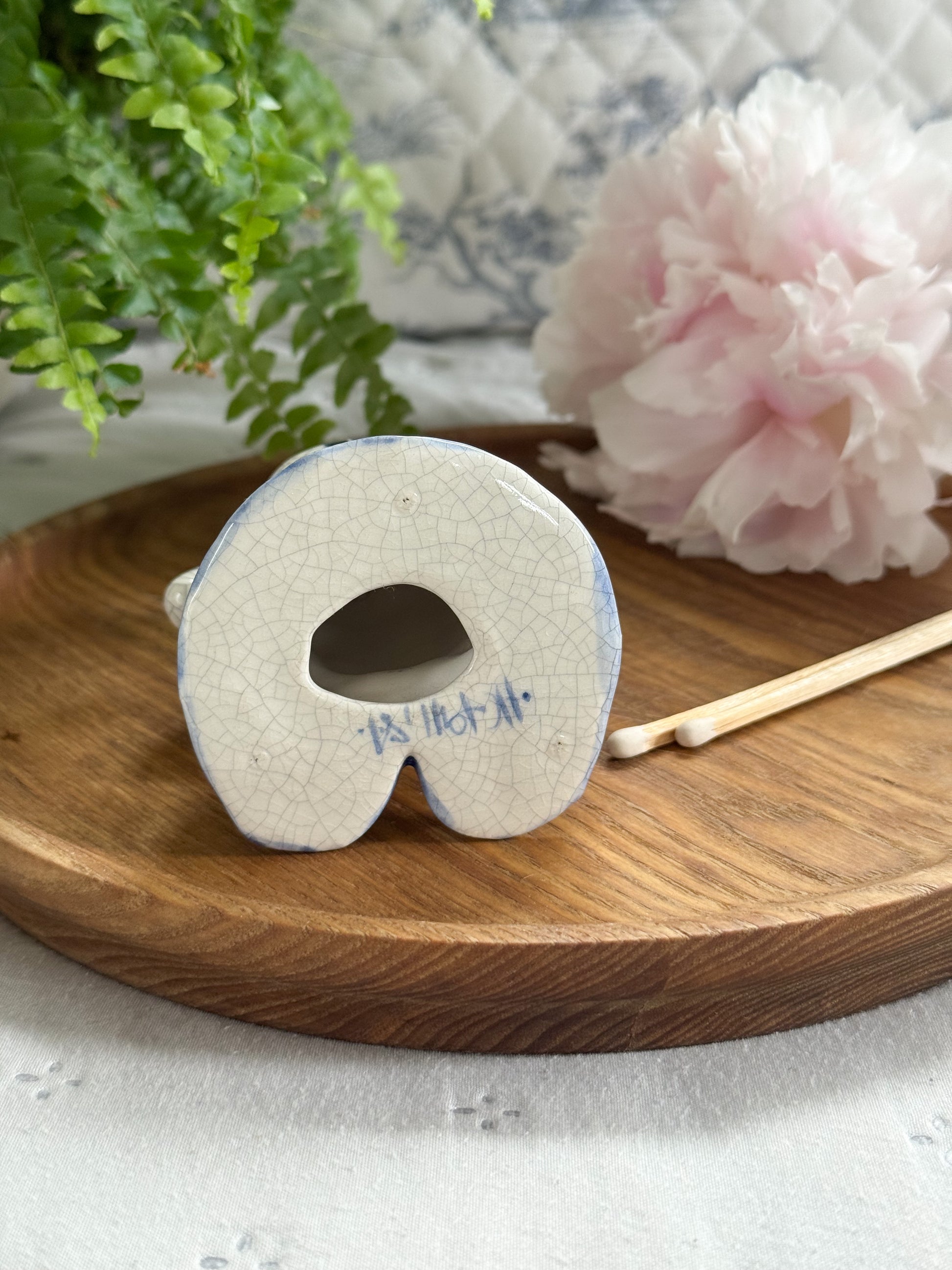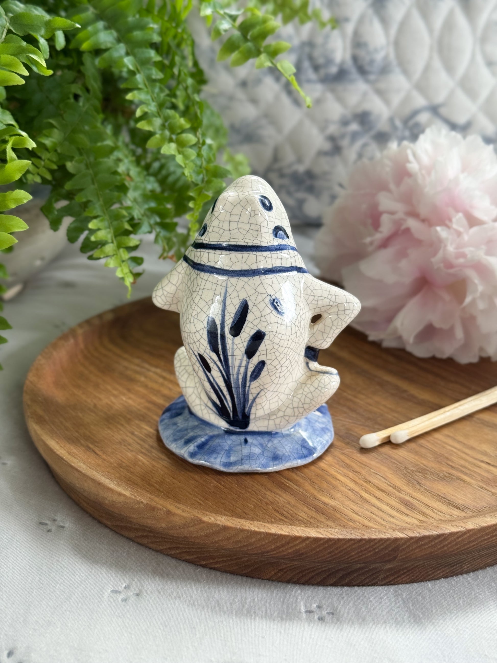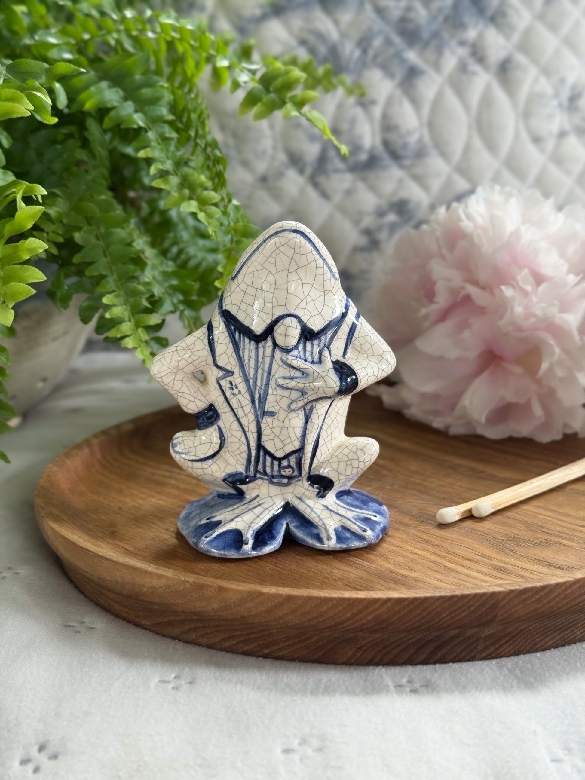 A wonderfully eccentric little toad, dressed to the nines in a hand-painted blue and white suit, complete with tie, waistcoat, and pocket square. This charming sculpture is handmade and signed by the artist (though I haven’t been able to identify the signature), and finished in a beautifully crazed crackle glaze that adds such depth and character.