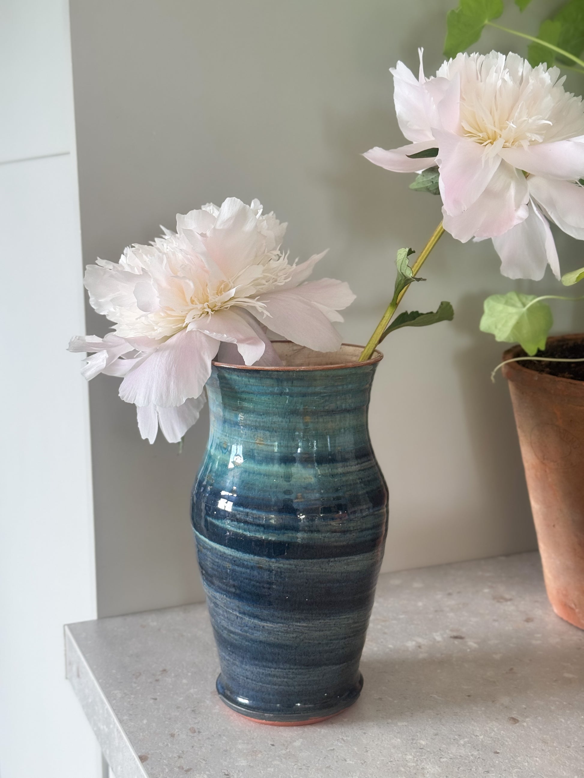 This particular vase features deep, atmospheric bands of oceanic blue and teal glaze, layered over warm terracotta clay with a softly flared rim and gently curving form. The surface shows subtle throwing rings that reveal the maker’s hand, offering a tactile sense of the making process. On the base, it is stamped: WOLD, HAND THROWN, ROUTH BEVERLY YORKSHIRE.