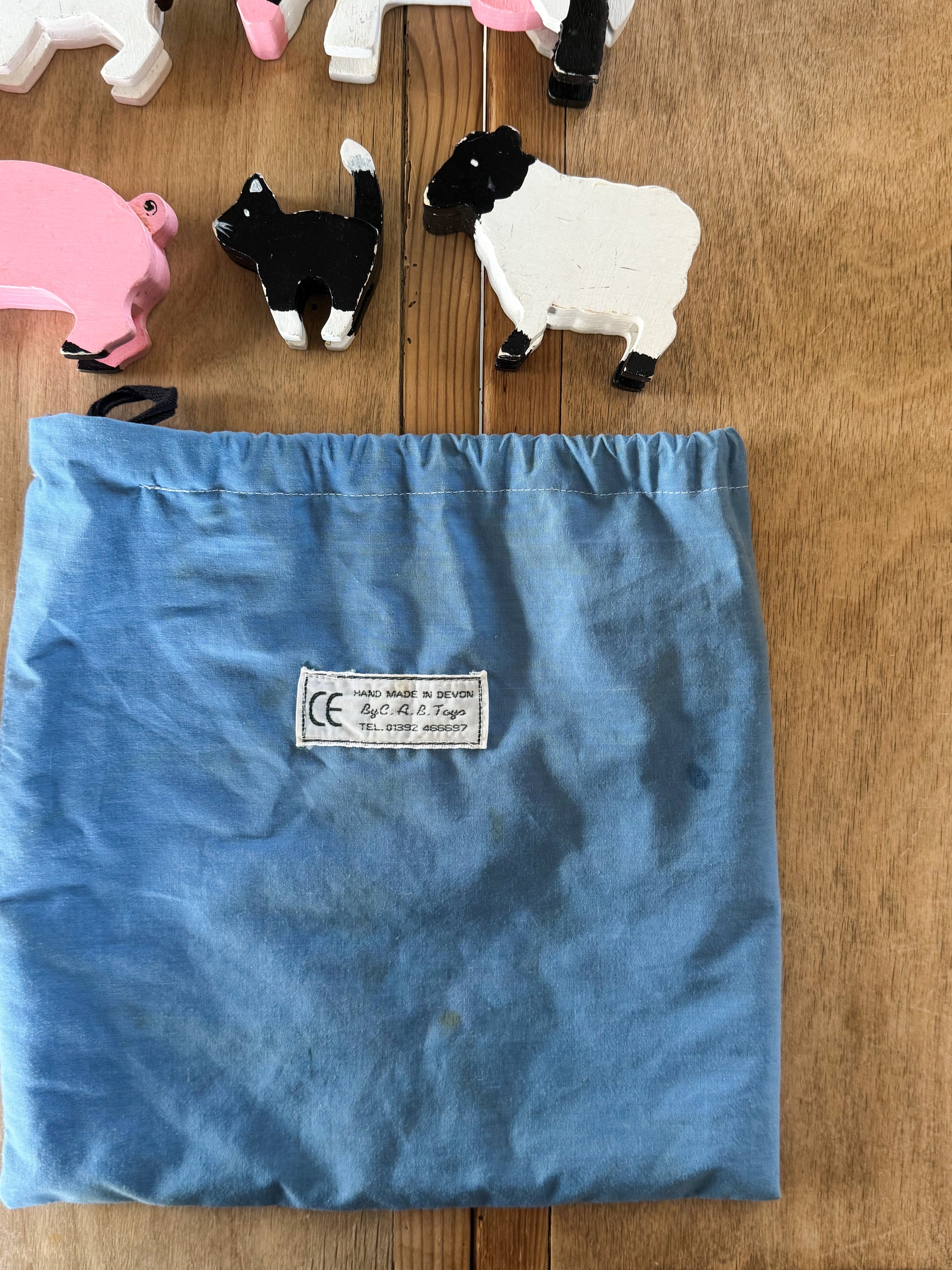 The set has all the signs of a toy that’s been properly loved, beautiful chippy paint, softened edges, and that lovely worn-in feel that only comes from years of happy play. They come tucked inside their original handmade drawstring bag, also by C.A.B Toys, finished with two stitched farmyard panels. There are a couple of small marks on the bag (please see photos), but it still has so much charm and life left in it.