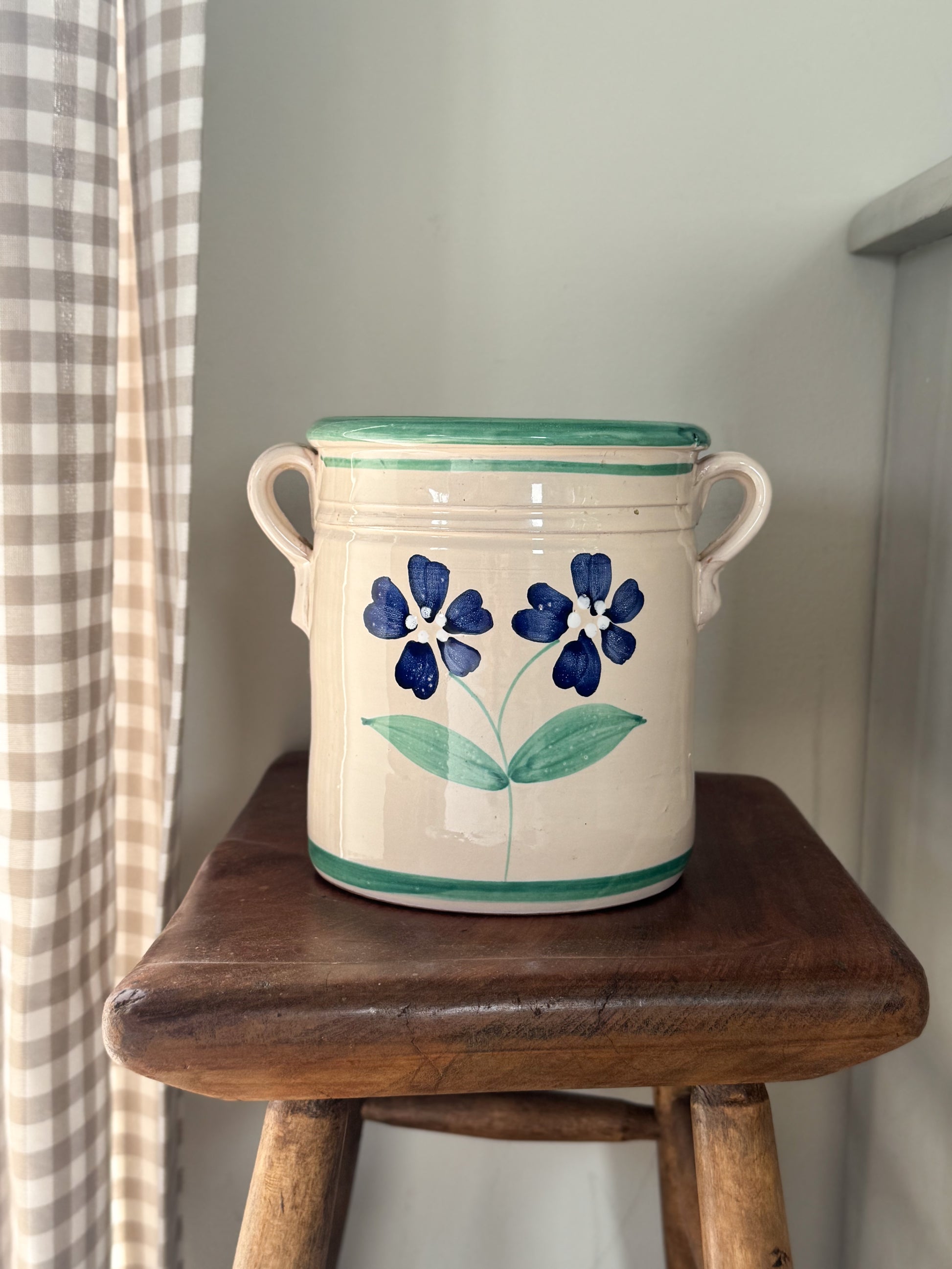 A beautiful large terracotta handled pot, hand made in Italy by Lamas Pottery. This rustic studio pottery piece features a textured slip glaze in a soft cream tone with a vivid green rim, and a hand-painted floral design in rich cobalt blue with leafy green accents. The reverse is decorated with a bold abstract design, giving it versatility depending on how it’s styled.