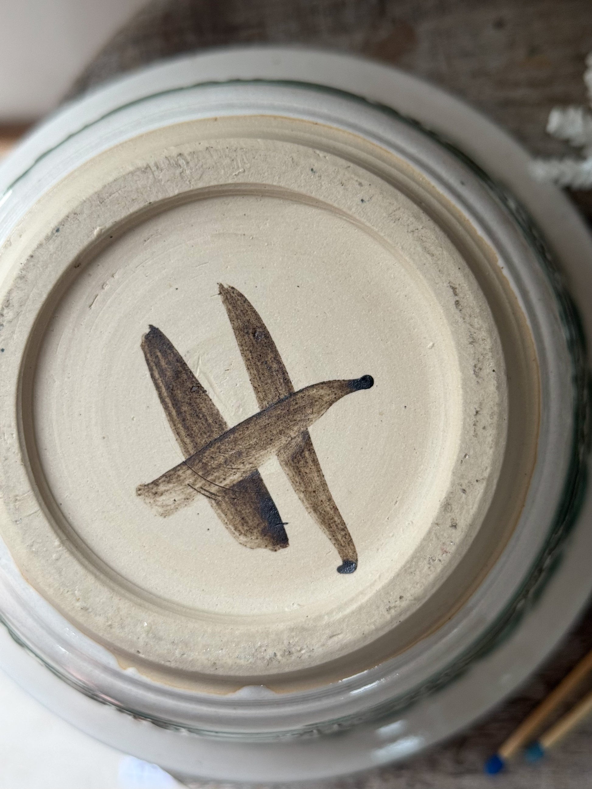 Its generous size makes it perfect for displaying a statement indoor plant, while the wide, flared rim adds balance and elegance to its form. The unglazed base bears Peter Hall’s distinctive maker’s mark.