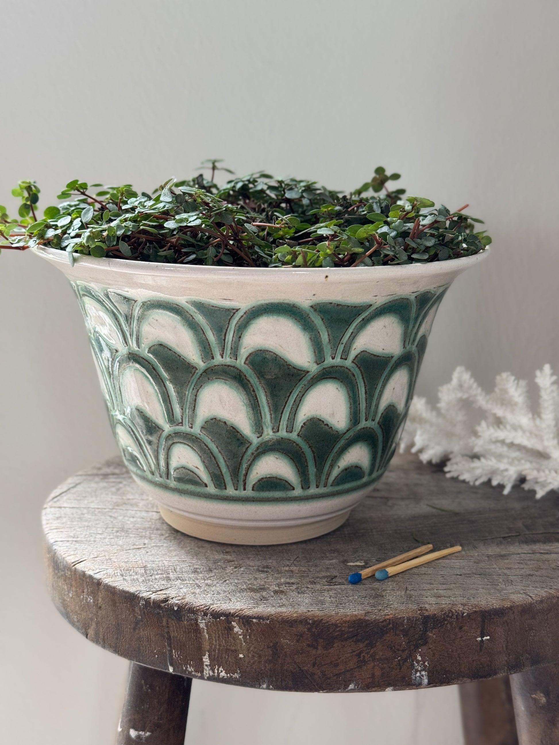 A beautifully hand-thrown fluted planter by British potter Peter Hall of Pennine Studios, Lancashire. This substantial piece features a bold scalloped design in deep green glaze, contrasted with a soft, natural stoneware body. The raised relief pattern creates a striking play of light and shadow, giving the piece wonderful depth and texture.