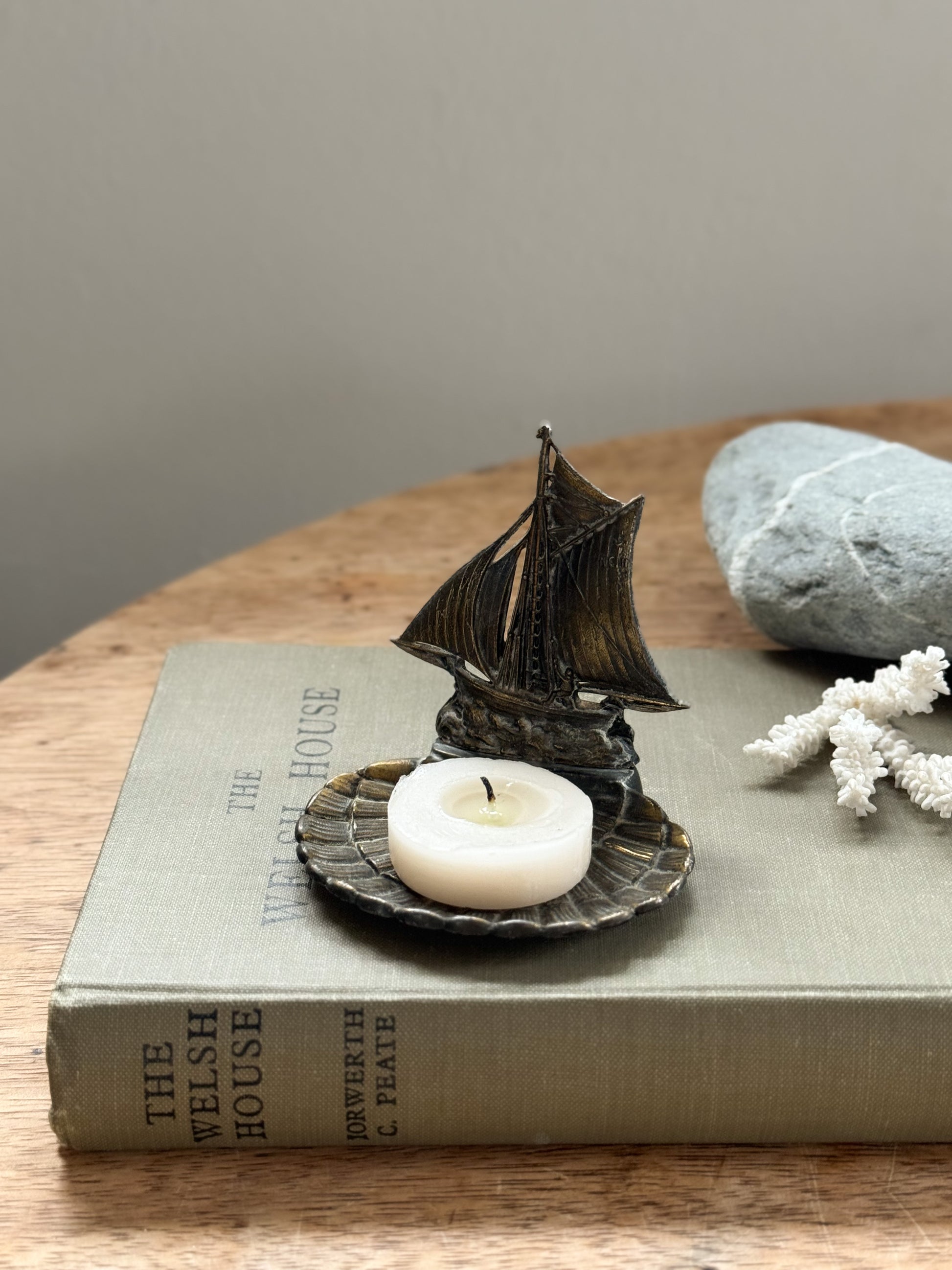 A charming vintage brass sailboat ashtray, now beautifully repurposed as a candle holder, a piece that seems to catch the warmth of the sea and the glow of candlelight all at once. The sailboat rises gracefully from a scallop shell base, stamped “RCH ⚓️” on the sail and “FRANCE” on the underside, reflecting the quiet craftsmanship of mid-century French design.