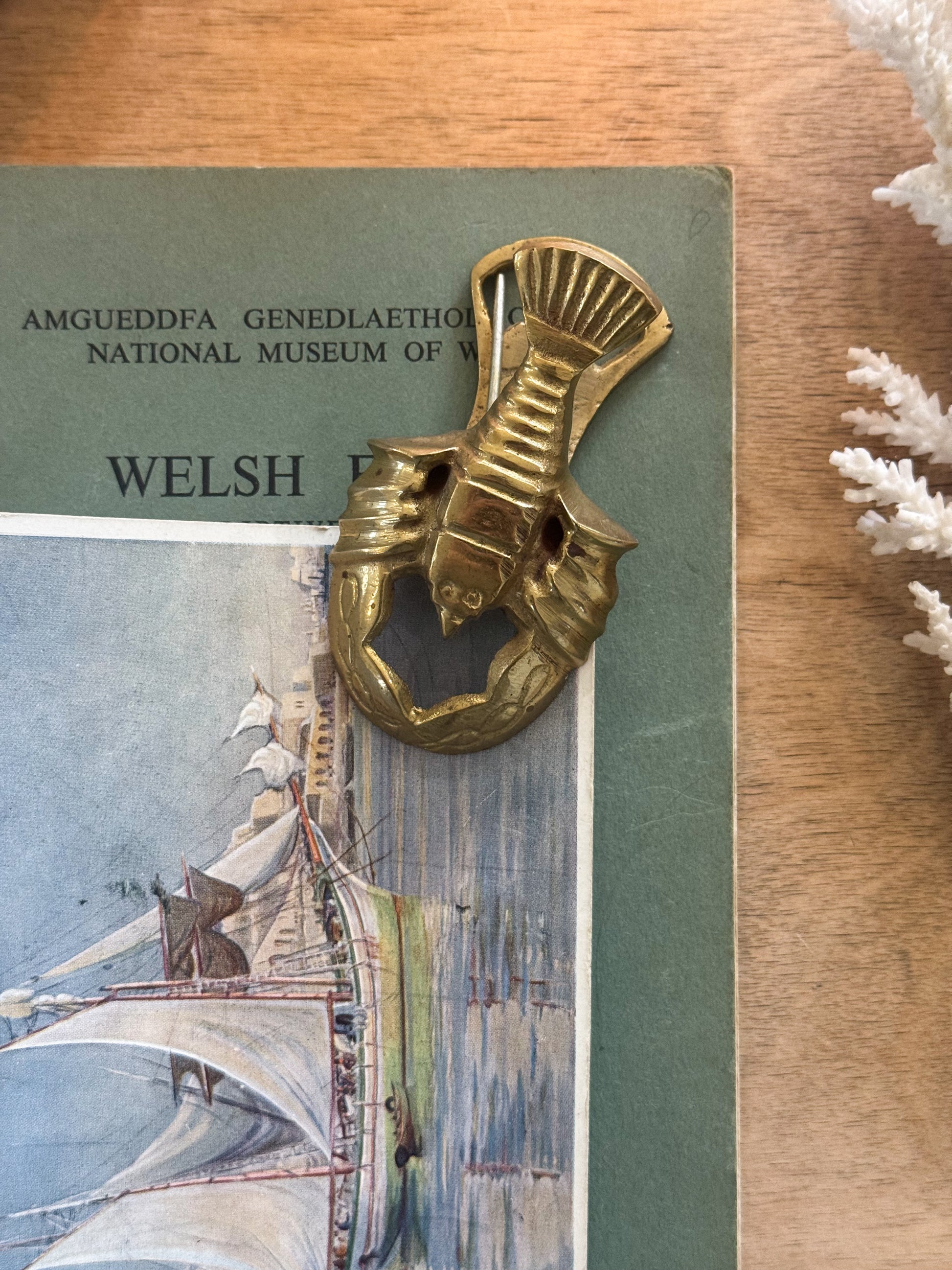 A wonderfully characterful vintage solid brass letter clip in the shape of a lobster, a midcentury piece full of charm and personality. We’ve added a length of naturally dyed, handmade ribbon for hanging, making it as beautiful on display as it is useful.