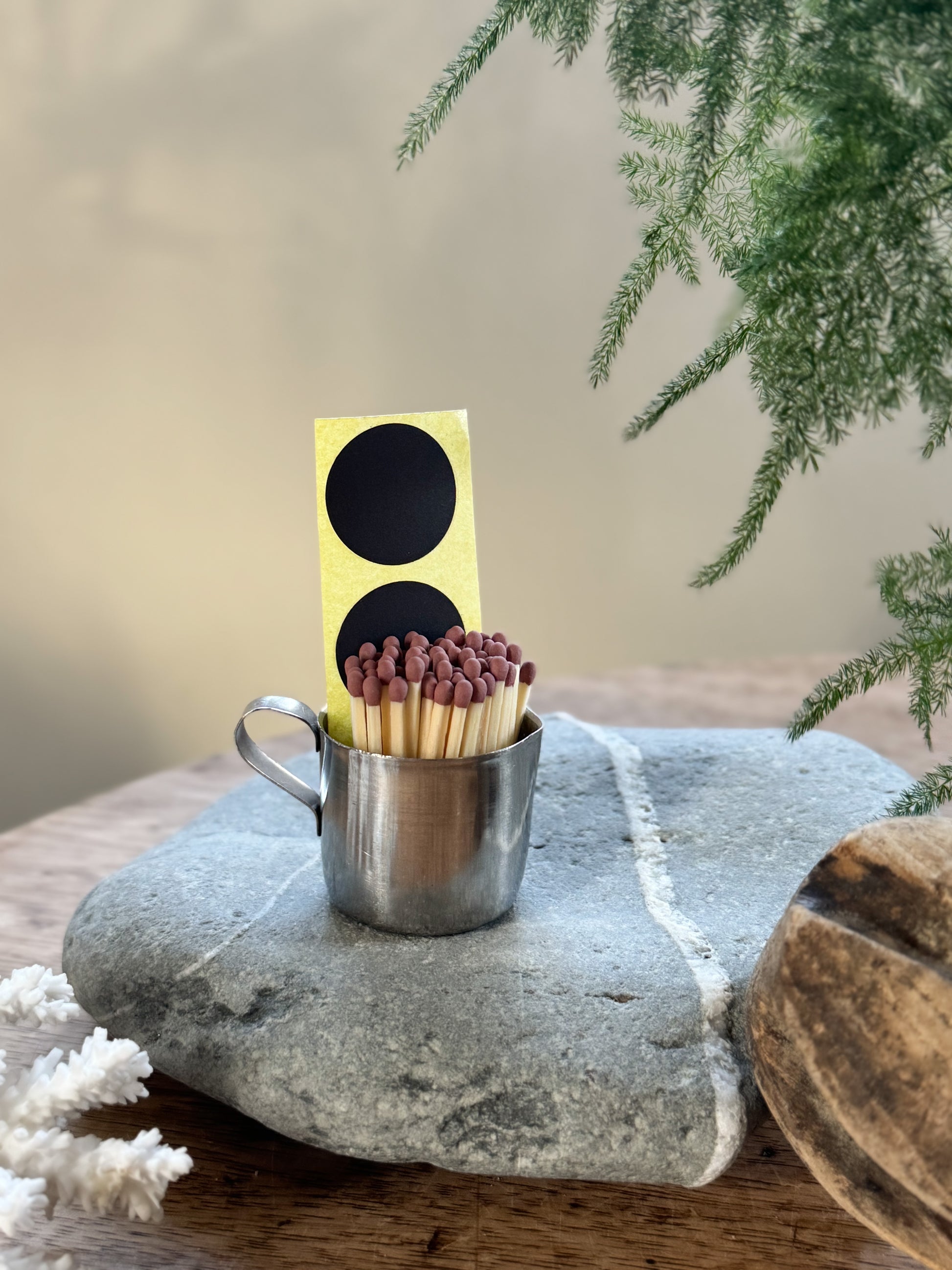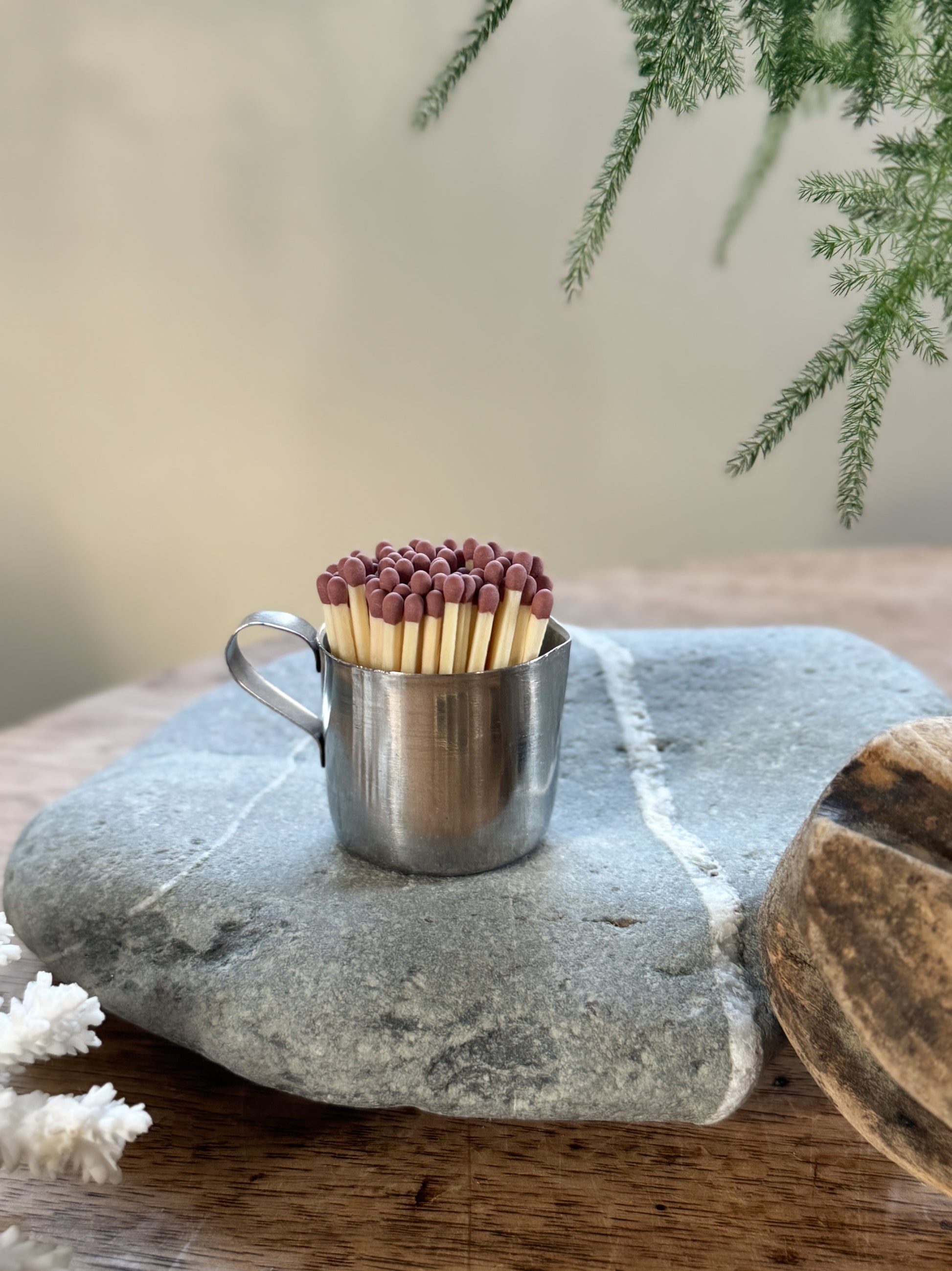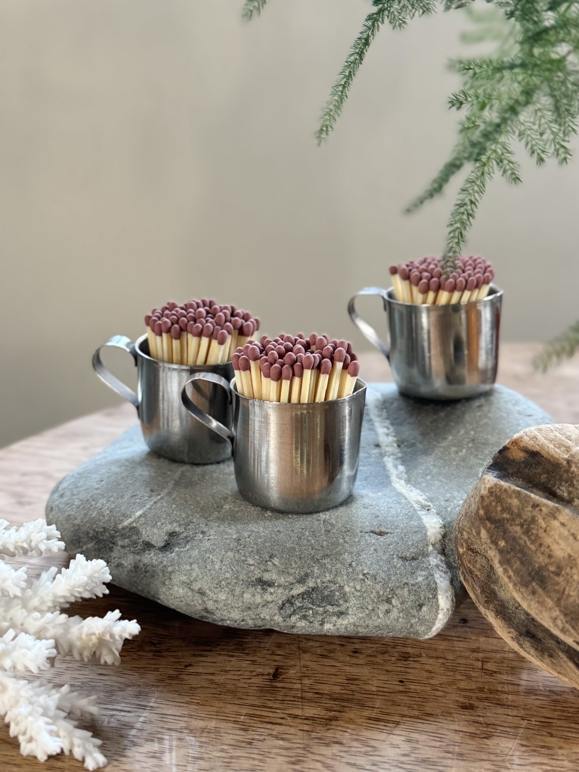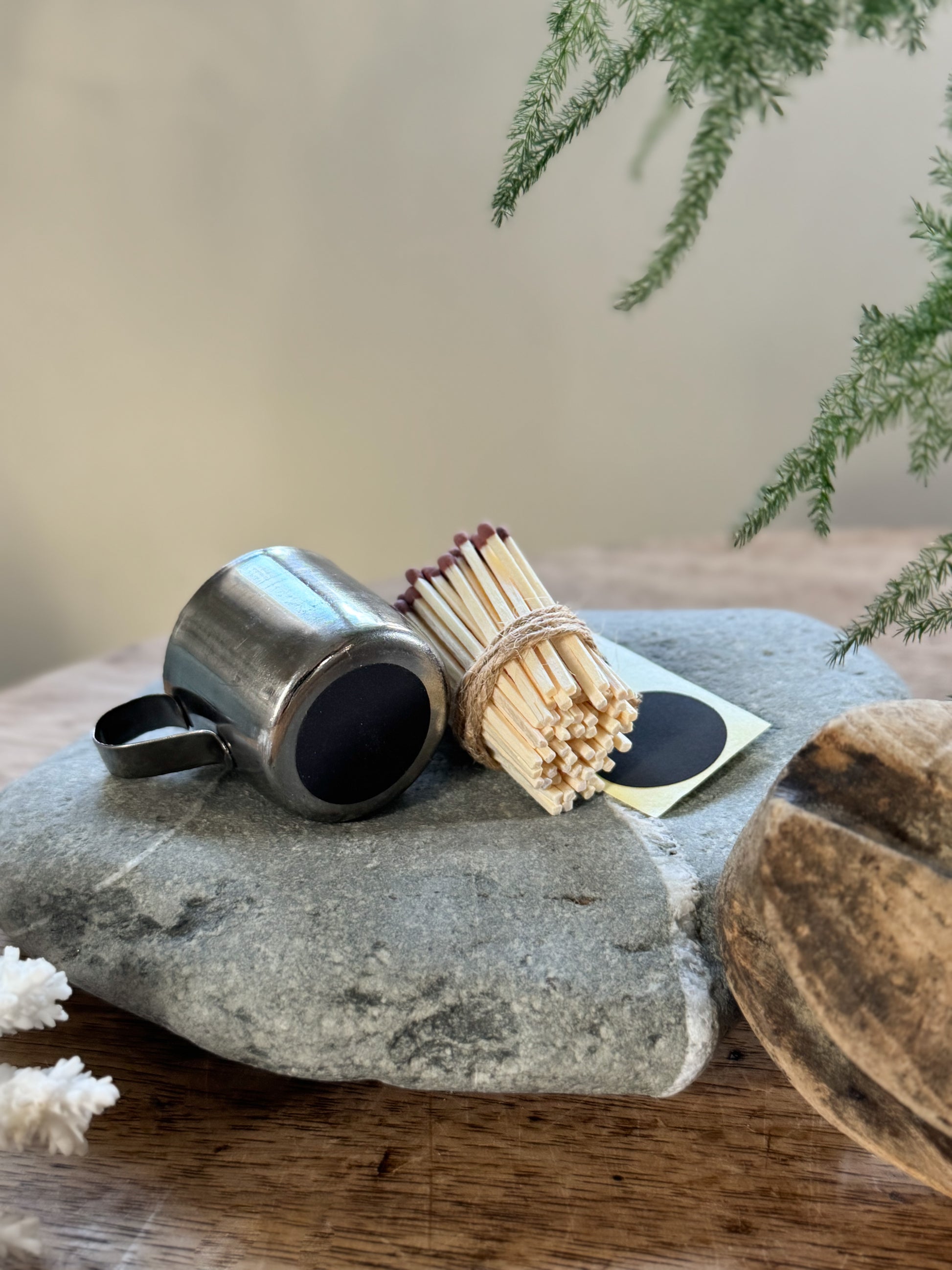 Made from brushed stainless steel with a soft, time-worn patina, every jug has a striker plate applied neatly to its base. Inside, you’ll find long, mauve-tipped safety matches bundled with twine, ready to sit beautifully on a mantelpiece, bedside table, bathroom shelf, or beside your favourite candle.