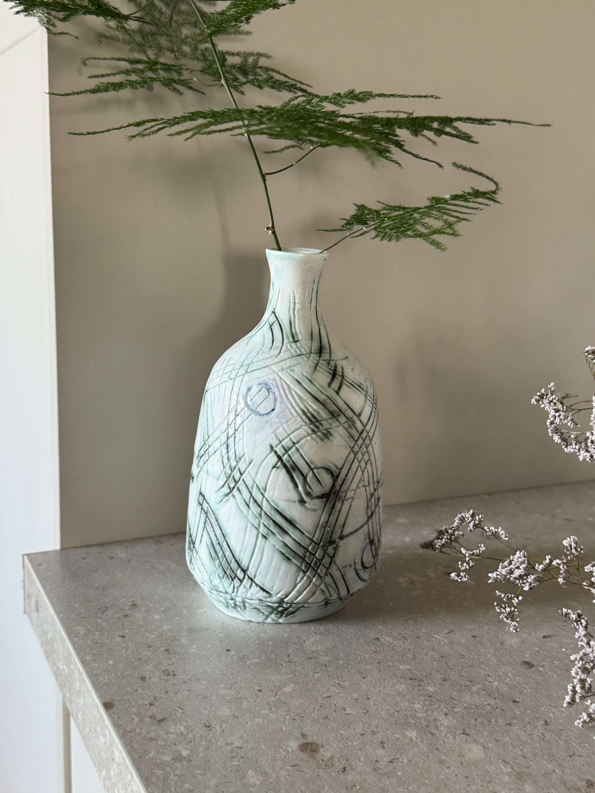 This sculptural bottle-form vase is hand-thrown with a softly faceted body and finished in a pale, sea-glass glaze washed over incised, free-flowing abstract lines. The decoration has a wonderfully fluid, almost coastal energy, like wind patterns, waves, or tide lines caught in motion.