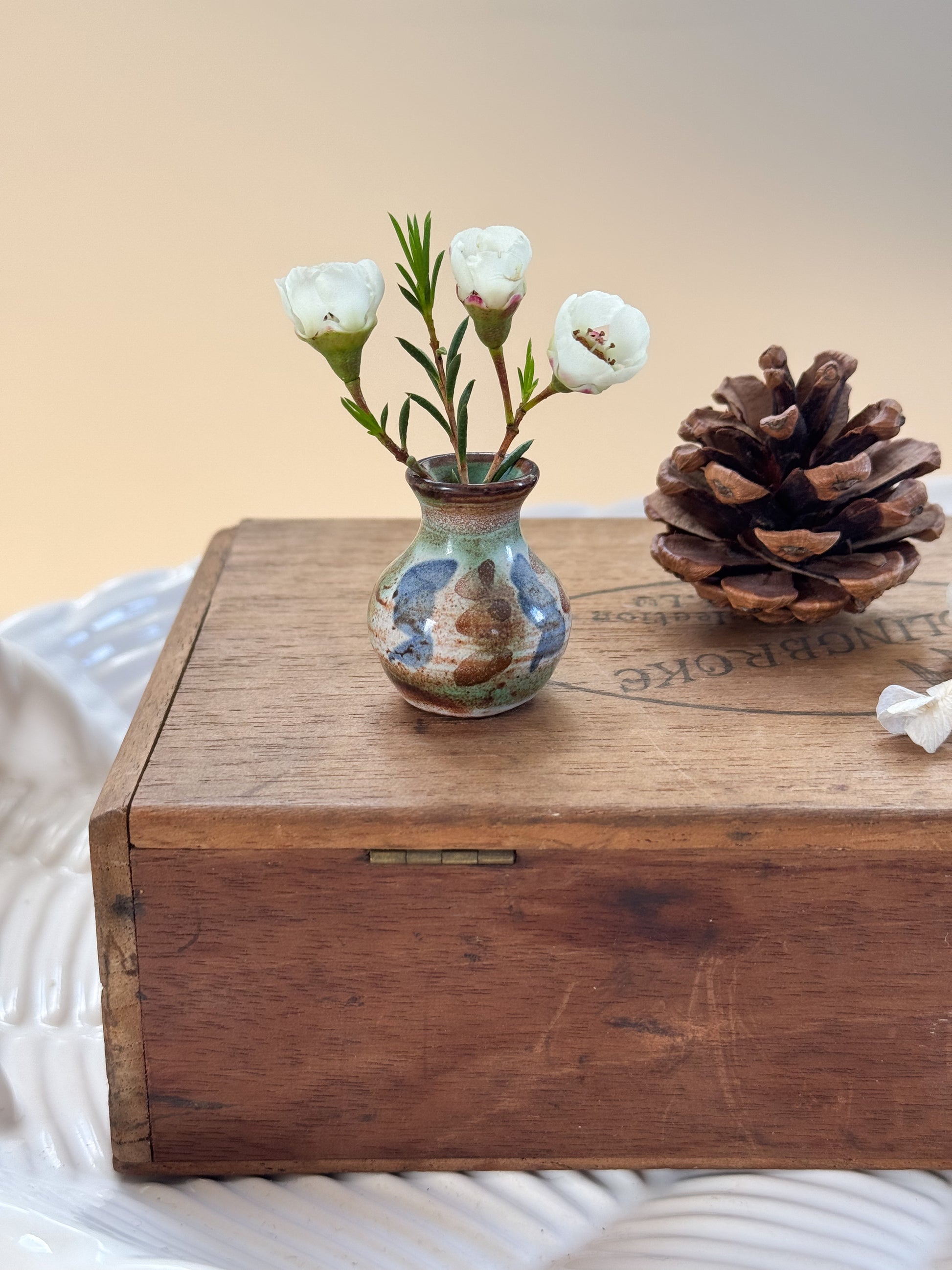 A perfectly formed piece of Cornish studio pottery in miniature. This Tintagel vase, with its earthy glaze and hand-painted abstract decoration, was originally made as a collector’s item or dolls house miniature and now finds new life as a tiny treasure for your home.