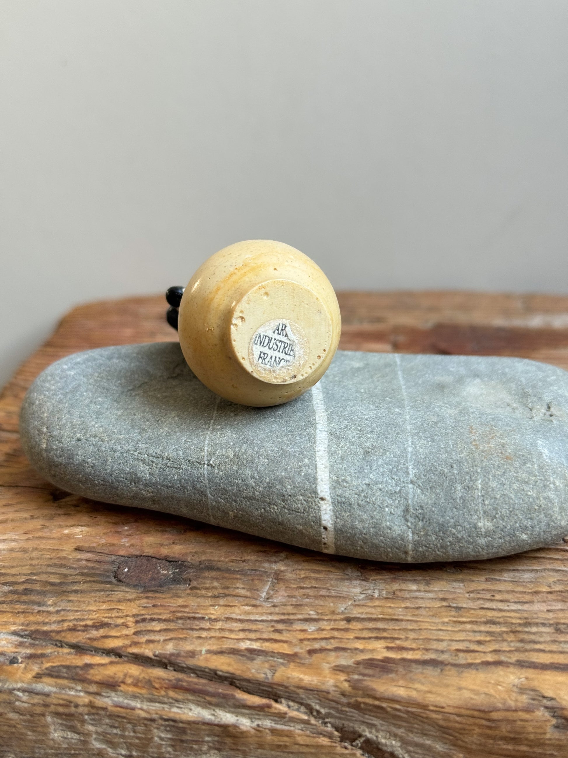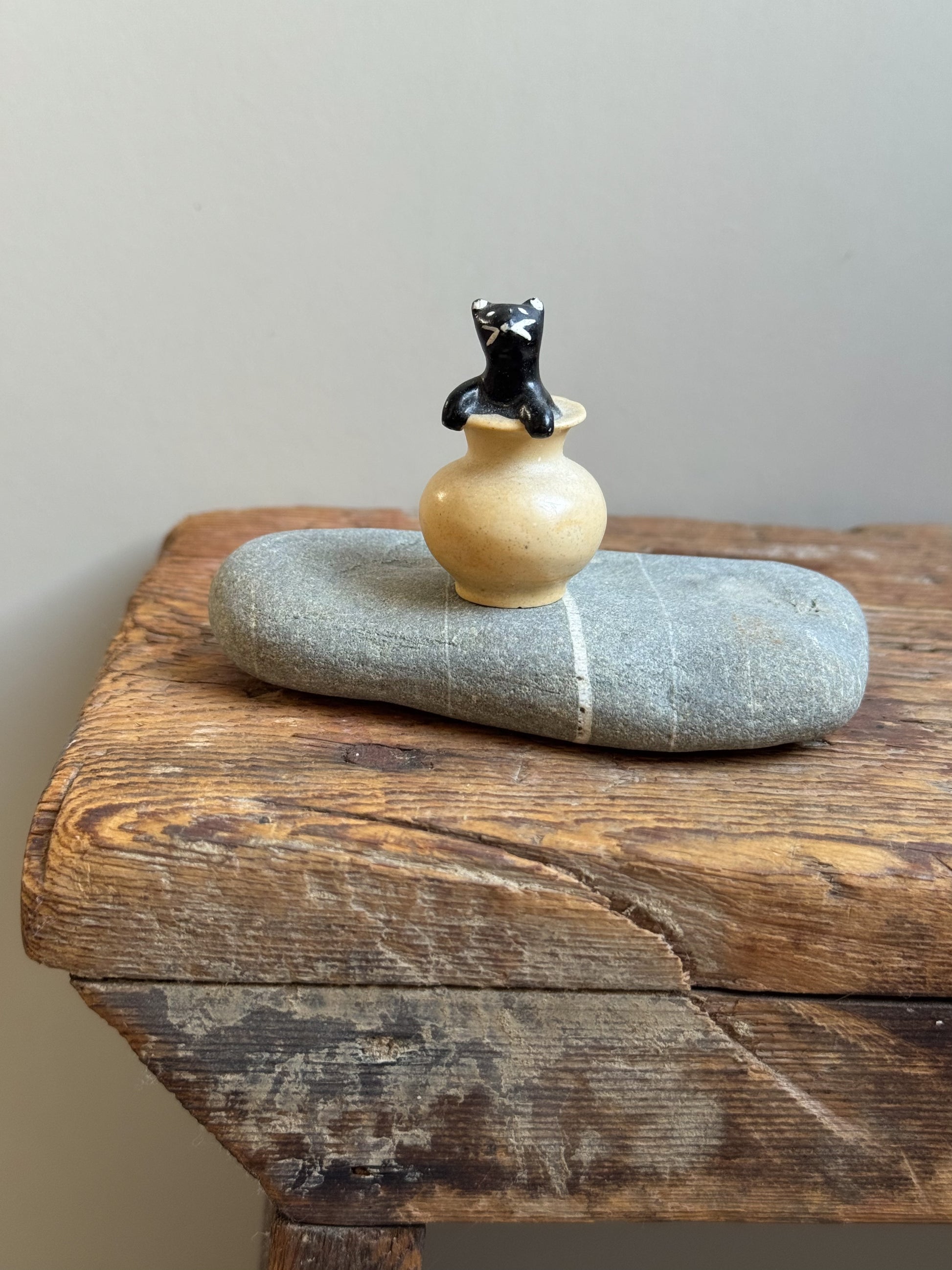 An irresistibly charming little find, a black cat peeking out of a warm honey-toned pot, complete with a French maker’s label to the base (AR Industrie, France). Likely made of resin, this tiny piece carries heaps of charm and character, the sort of curious miniature that instantly sparks a smile.