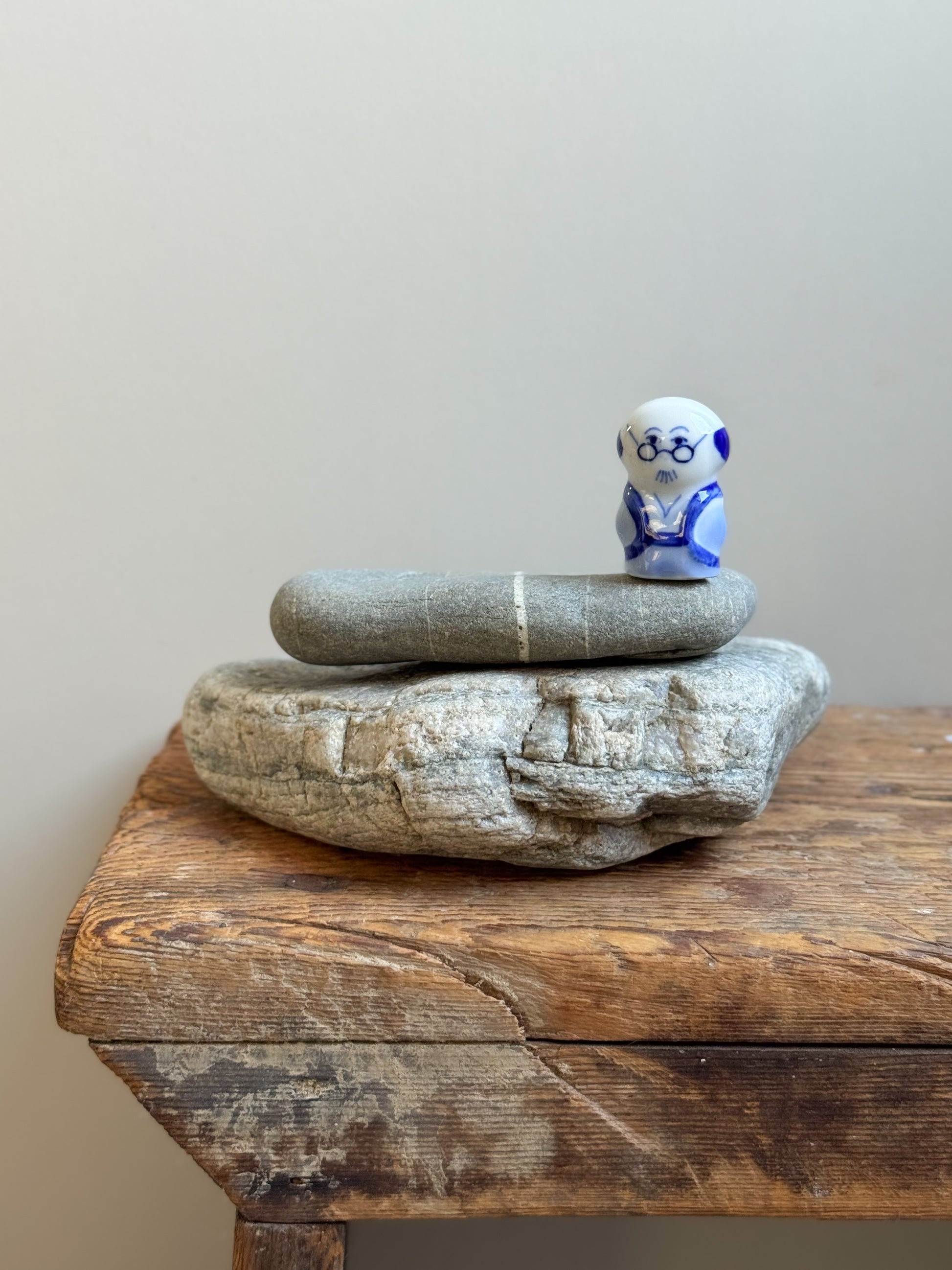 A tiny porcelain figure full of character, hand-painted in classic blue and white, depicting a bespectacled gentleman with the most serious expression and a neatly painted suit. Despite his miniature scale, he carries a quiet dignity, the kind of curio that feels as though it belongs in a cabinet of wonders or tucked into the corner of a writing desk.