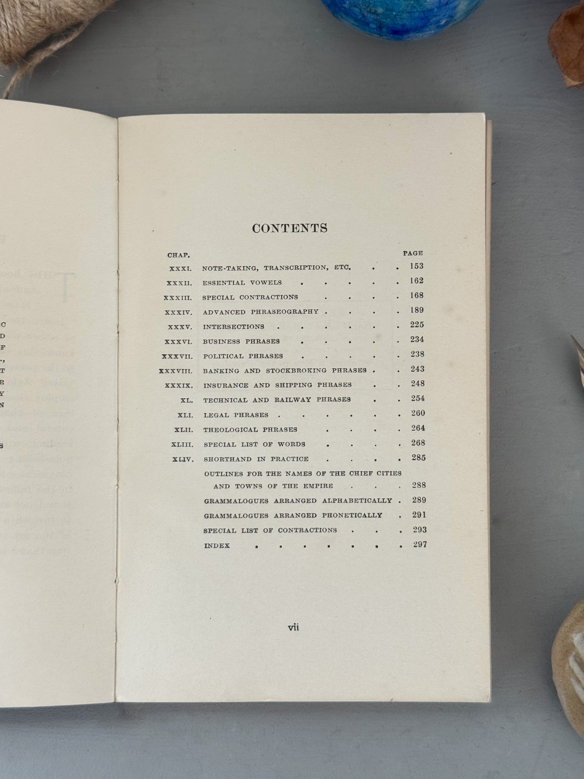 Bound in soft blue-grey card with dark cloth spine, this volume has an understated, utilitarian elegance that feels instantly of its time. Inside, crisp typography sits alongside the flowing, abstract symbols of Pitman shorthand, pages that read almost like visual poetry. Exercises, advanced phraseography, and specialist vocabularies reveal a world where speed, precision, and the written word mattered deeply.