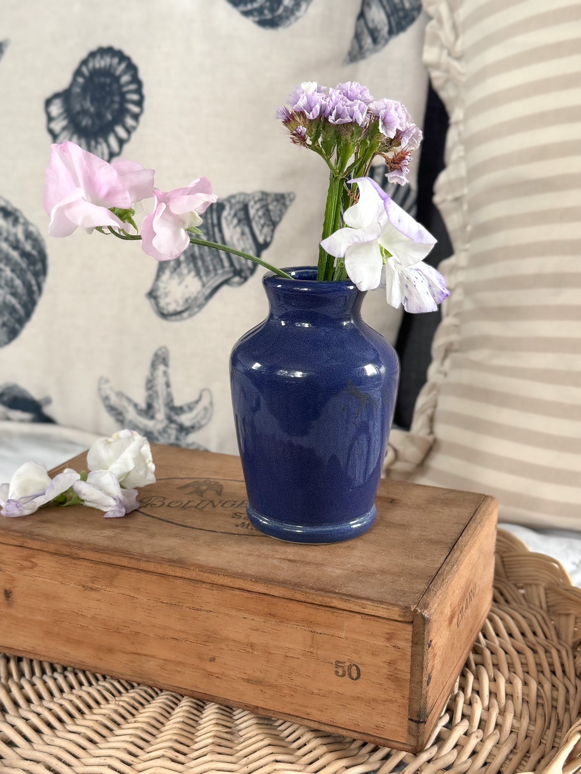 A beautifully made vintage glazed stoneware bottle in a rich, deep cobalt blue glaze, stamped RONUK to the base. Compact in size but full of presence, its classic, gently flared form and glossy finish make it perfect for a few gathered stems from the garden or a single branch in winter.