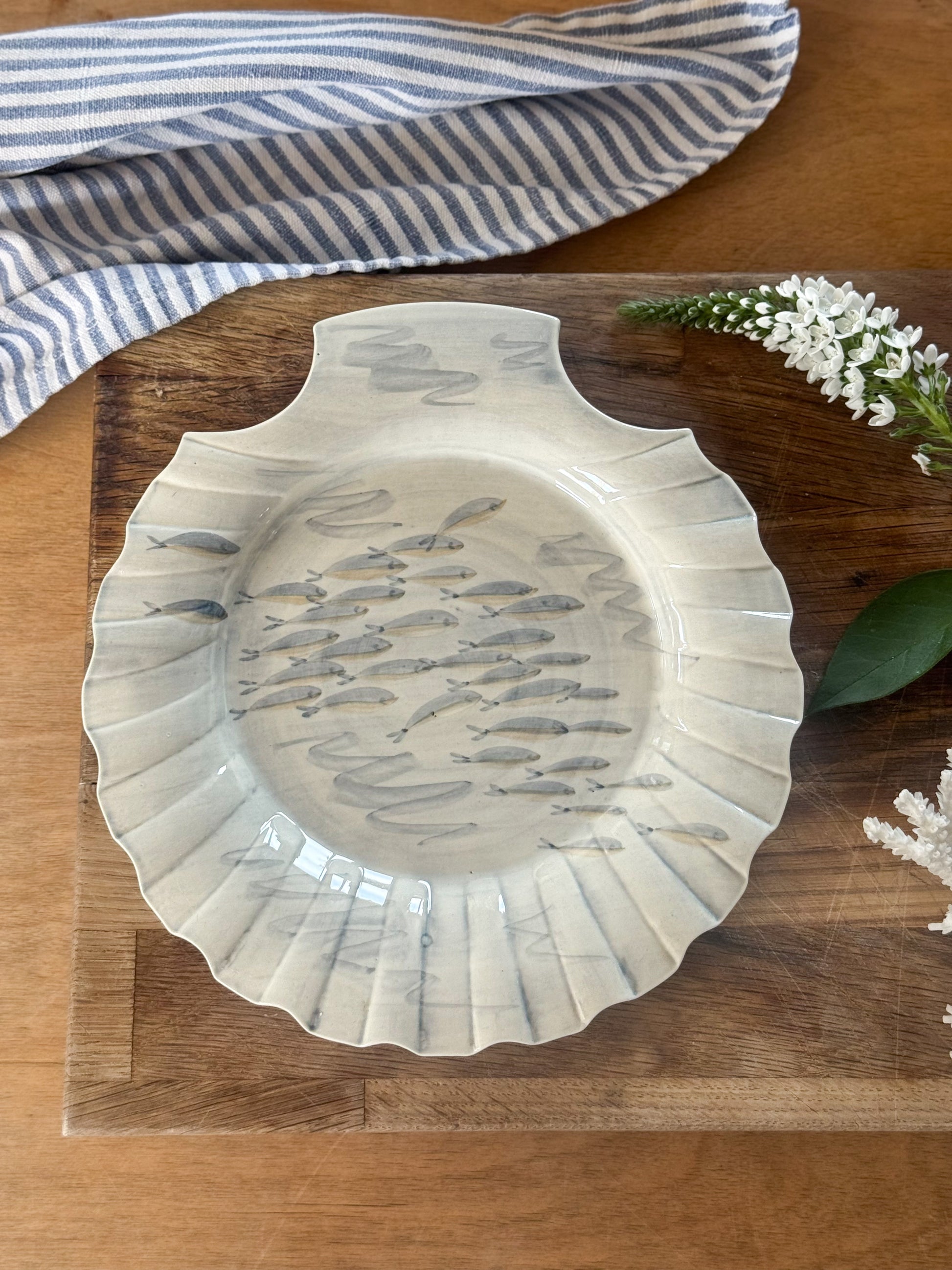 A beautiful and unique vintage pottery plate, shaped like a scallop shell and adorned with a soft, painterly school of fish. The pastel blues and greys of the design feel light and fluid, as though the fish are gently drifting through water, with delicate brushstrokes adding a sense of movement.