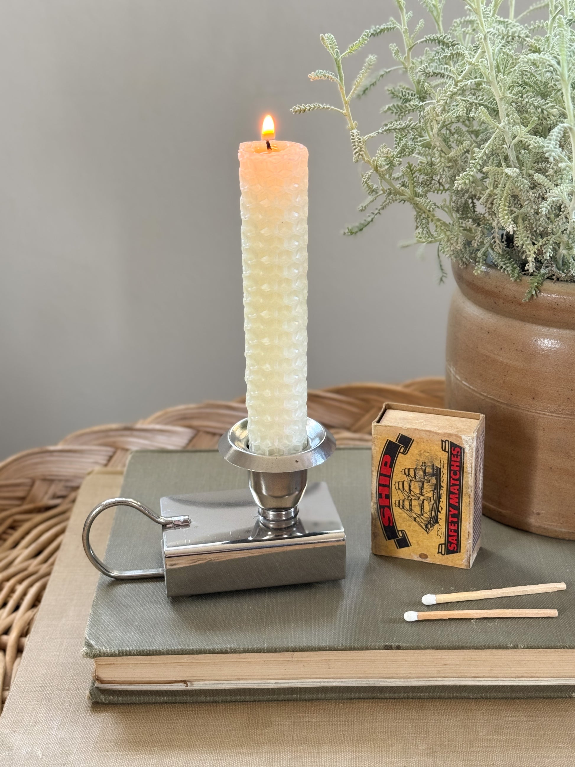 A clever and beautifully made silver plated chamberstick-style candle holder with a hidden detail, the base is designed to hold a box of matches snugly beneath, making it both practical and timeless. Complete with a vintage Ship Matchbox, it’s a piece that blends utility with charm.