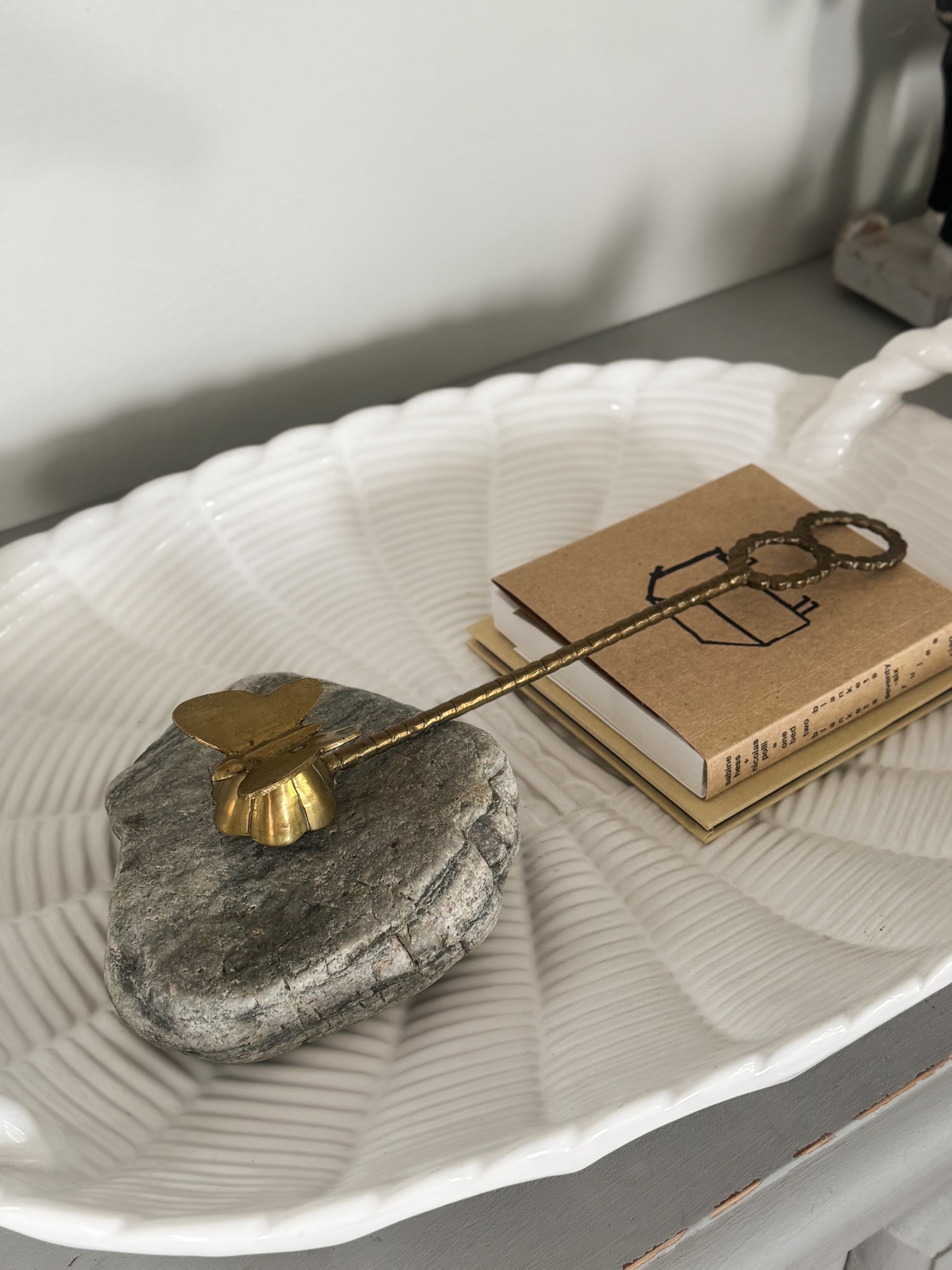 Put out your candles with a touch of poetry. This solid brass candle snuffer is crafted in the form of a butterfly, wings outstretched as though caught mid-flight, delicately perched upon a flower. The long handle is finished with beautiful looped detailing, not only comfortable to hold but perfect for hanging beside the mantel, fireplace, or even in the kitchen, ready for use.