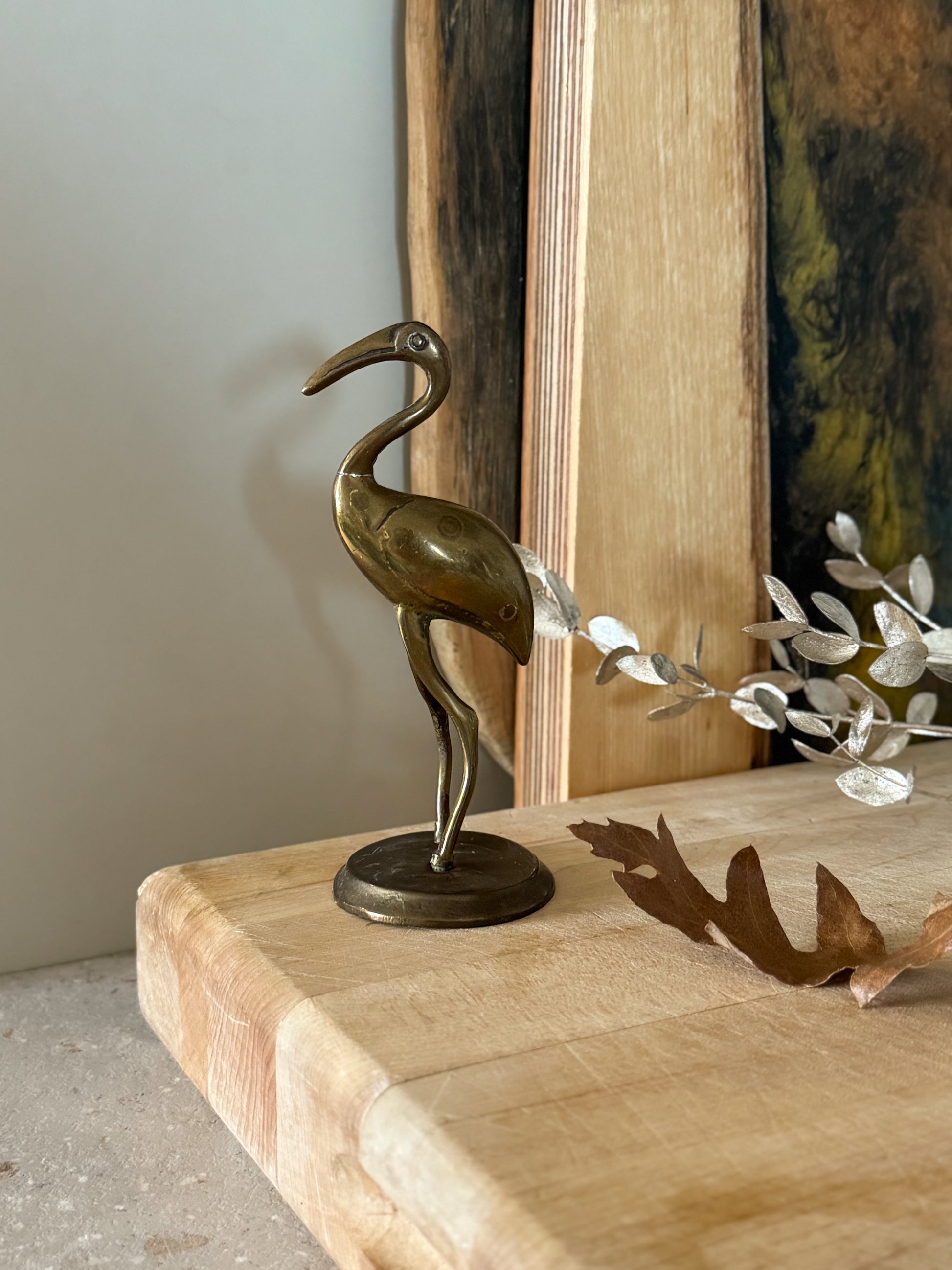 A beautifully cast solid brass flamingo, elegant and understated in form. The the long curved neck and slender legs give the piece a calm, sculptural presence.
