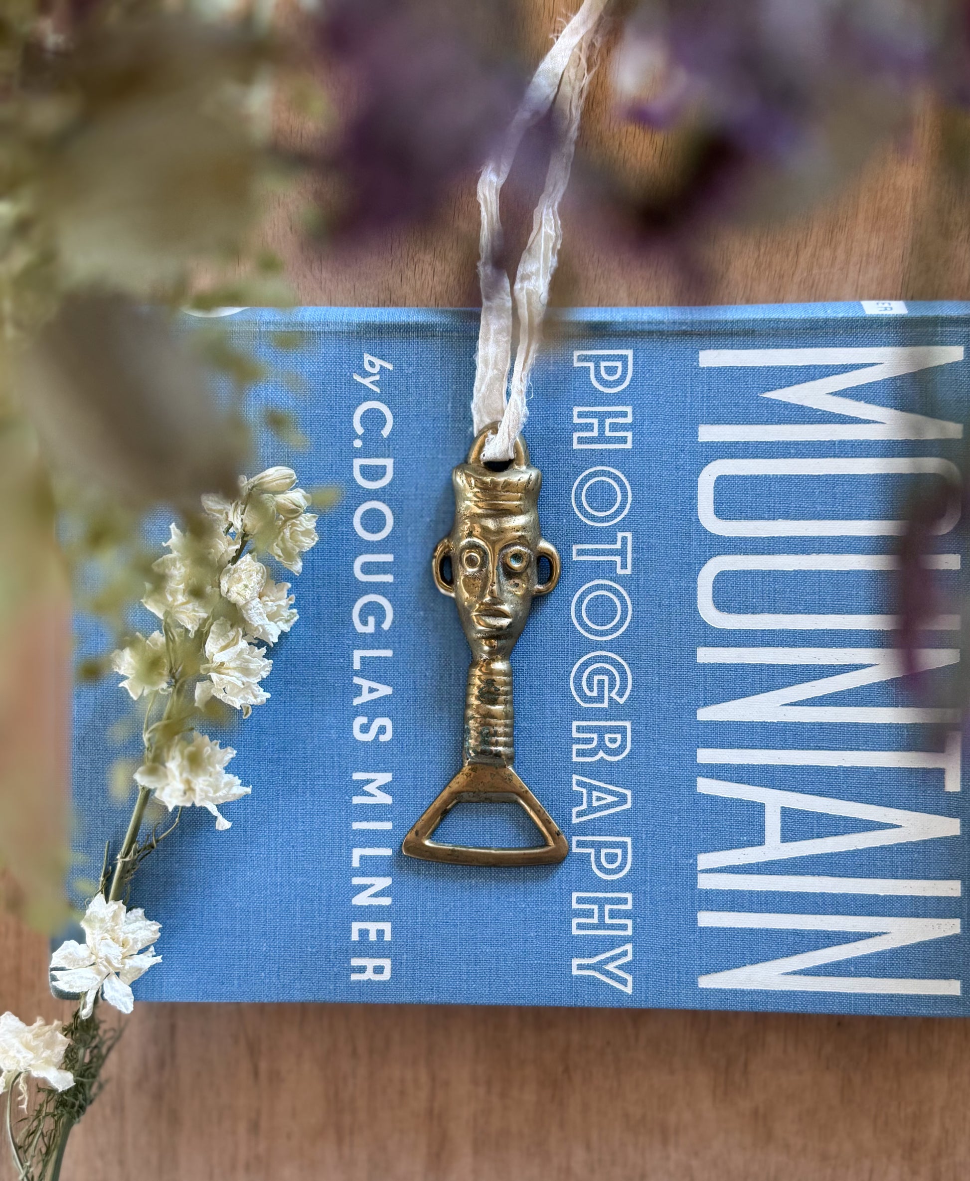 A beautifully tactile vintage solid brass bottle opener, cast in the form of a stylised folk figure with expressive features and a warm, time-worn patina - equal parts functional object and small sculptural charm.