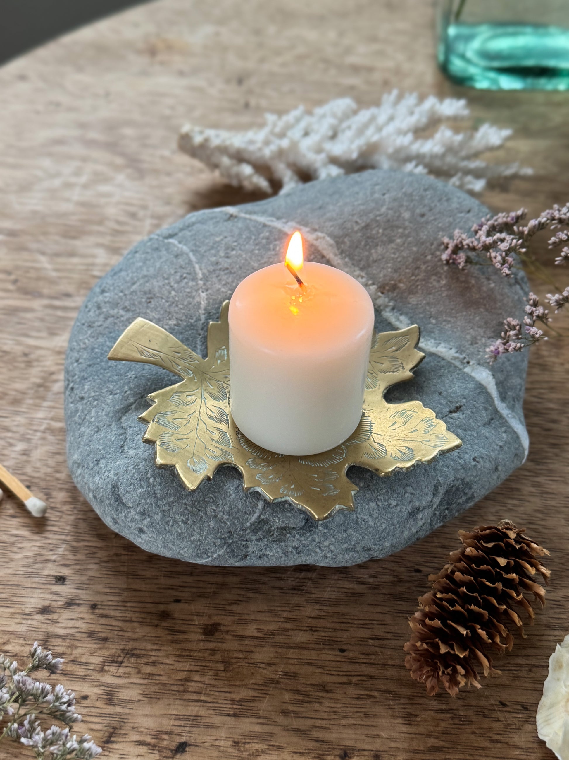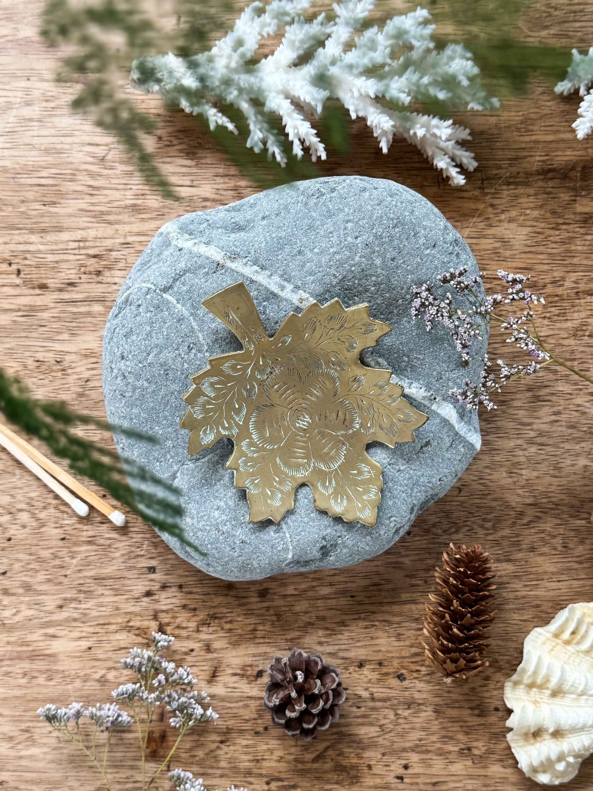 A beautifully detailed vintage solid brass leaf dish, richly adorned with delicate hand-etched floral motifs. Its warm golden tone and organic shape make it a timeless piece, one that feels equally at home styled on a bedside table, gathered into an autumnal vignette, or used as a gentle resting place for matches, jewellery, or a tealight candle.