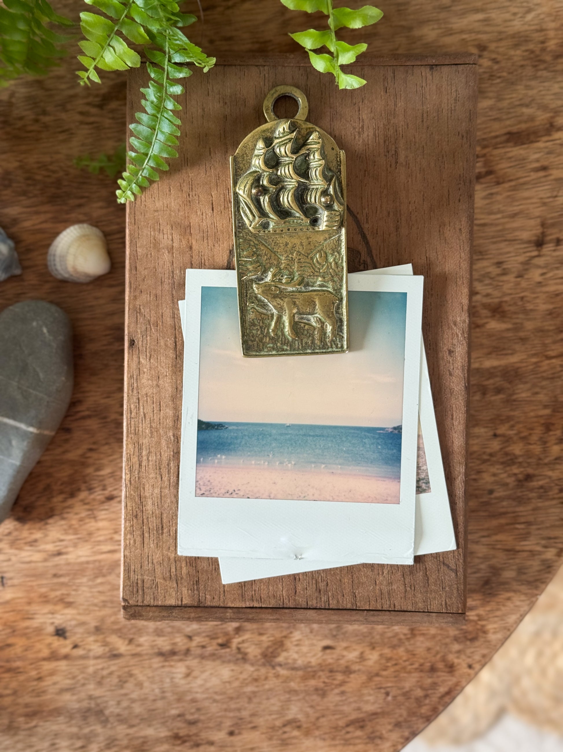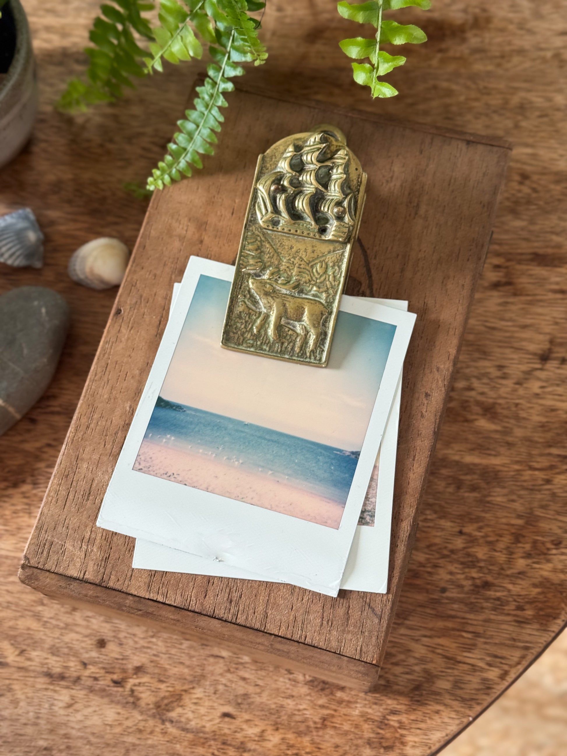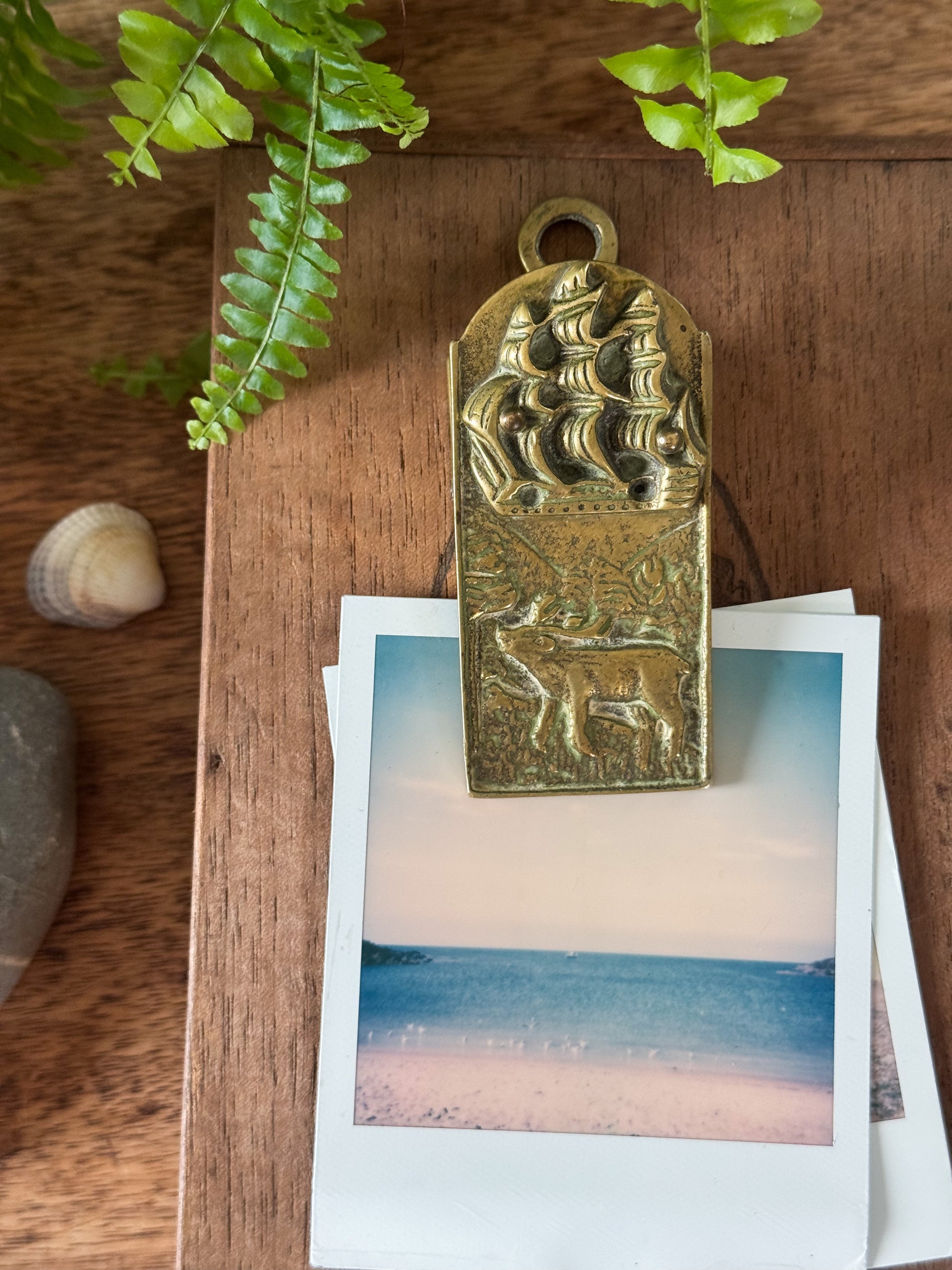 This beautifully detailed vintage solid brass letter clip features a sailing ship above a woodland stag, cast in rich relief with a warm, timeworn patina. A small hanging loop at the top allows it to be displayed on a gallery wall, perfect for showcasing a favourite photo, handwritten letter, or small art print. Equally lovely used flat on a coffee table or desk, it adds charm and character when holding Polaroids or keepsakes close at hand.