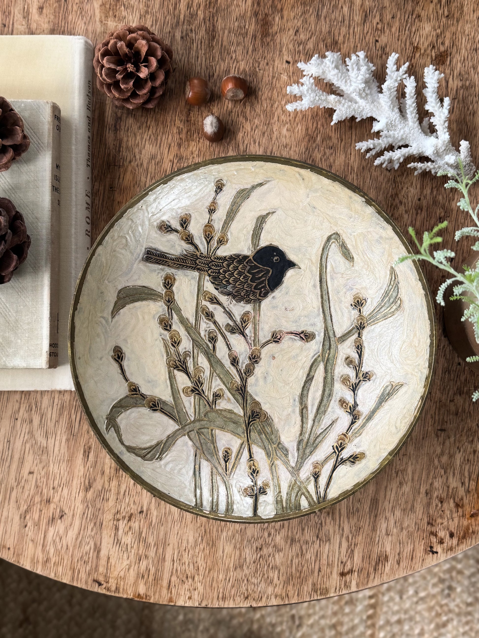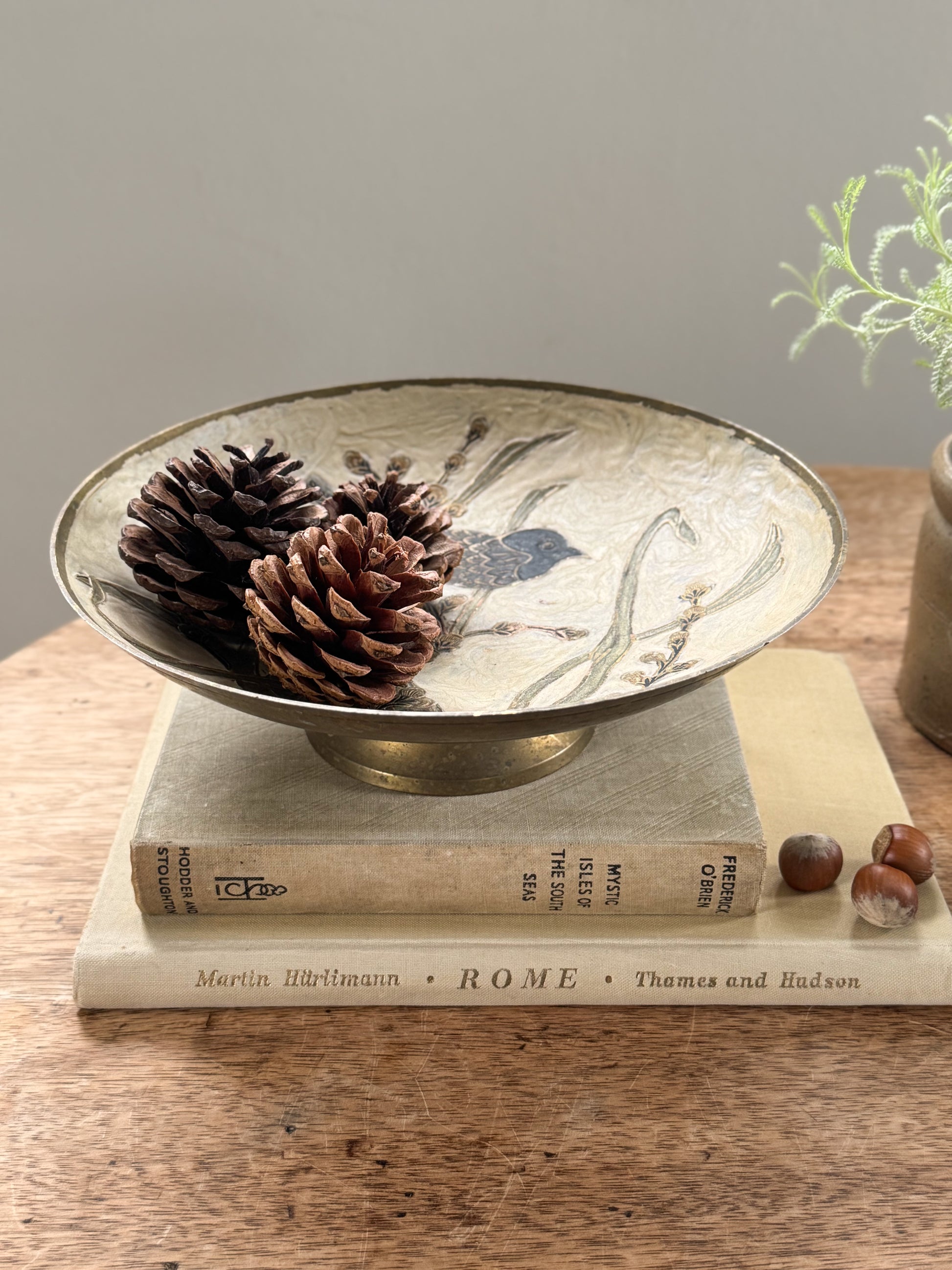 An extraordinary vintage find, this large solid brass pedestal bowl is a true work of art. The wide, shallow form has a beautifully weighted presence, but it’s the hand-painted enamel design that makes it utterly captivating: a delicate blackbird perched among soft green reeds and seed heads, painted with exquisite texture and detail.