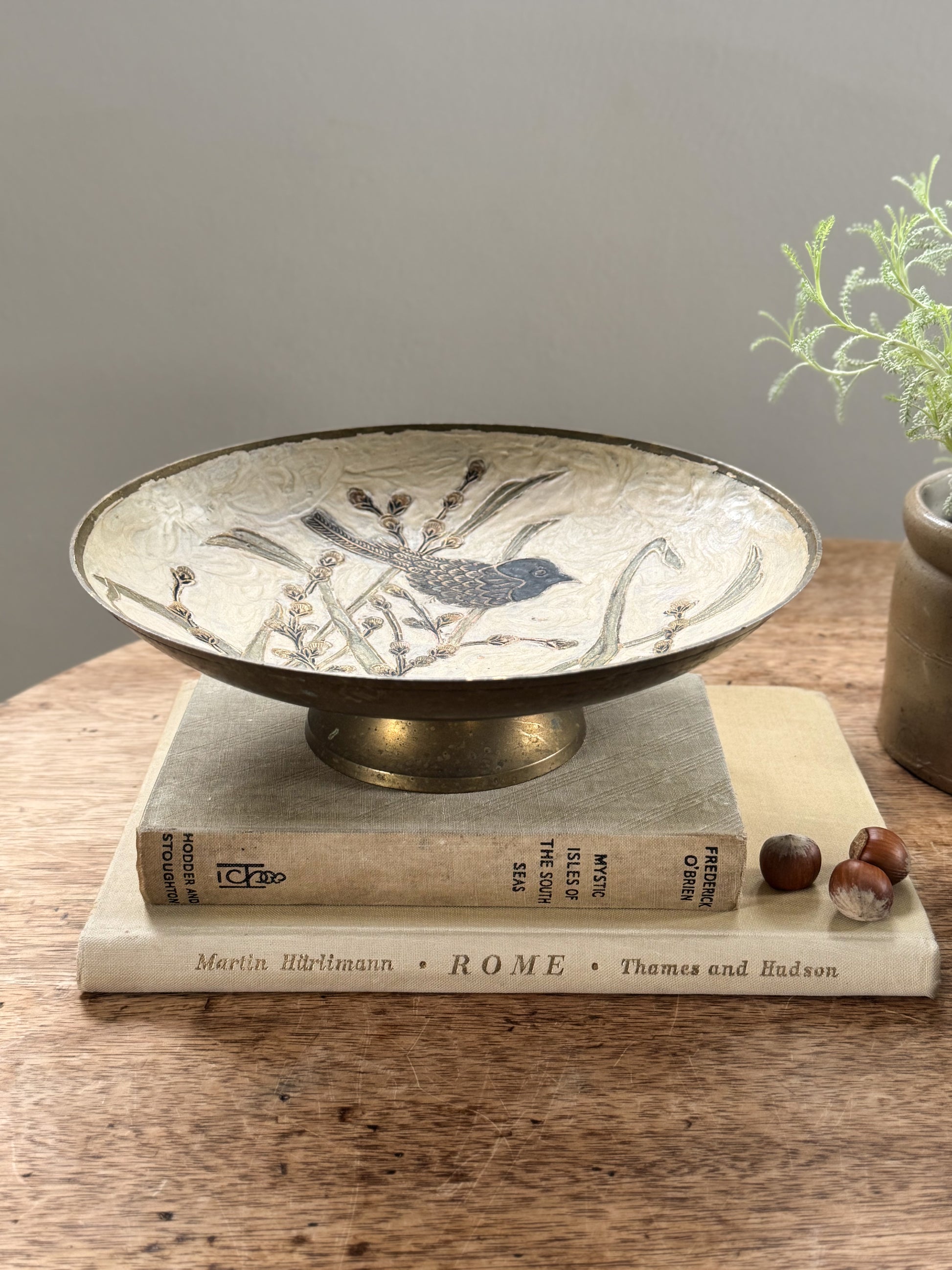 Vintage Solid Brass Pedestal Bowl with Hand-Painted Blackbird Design