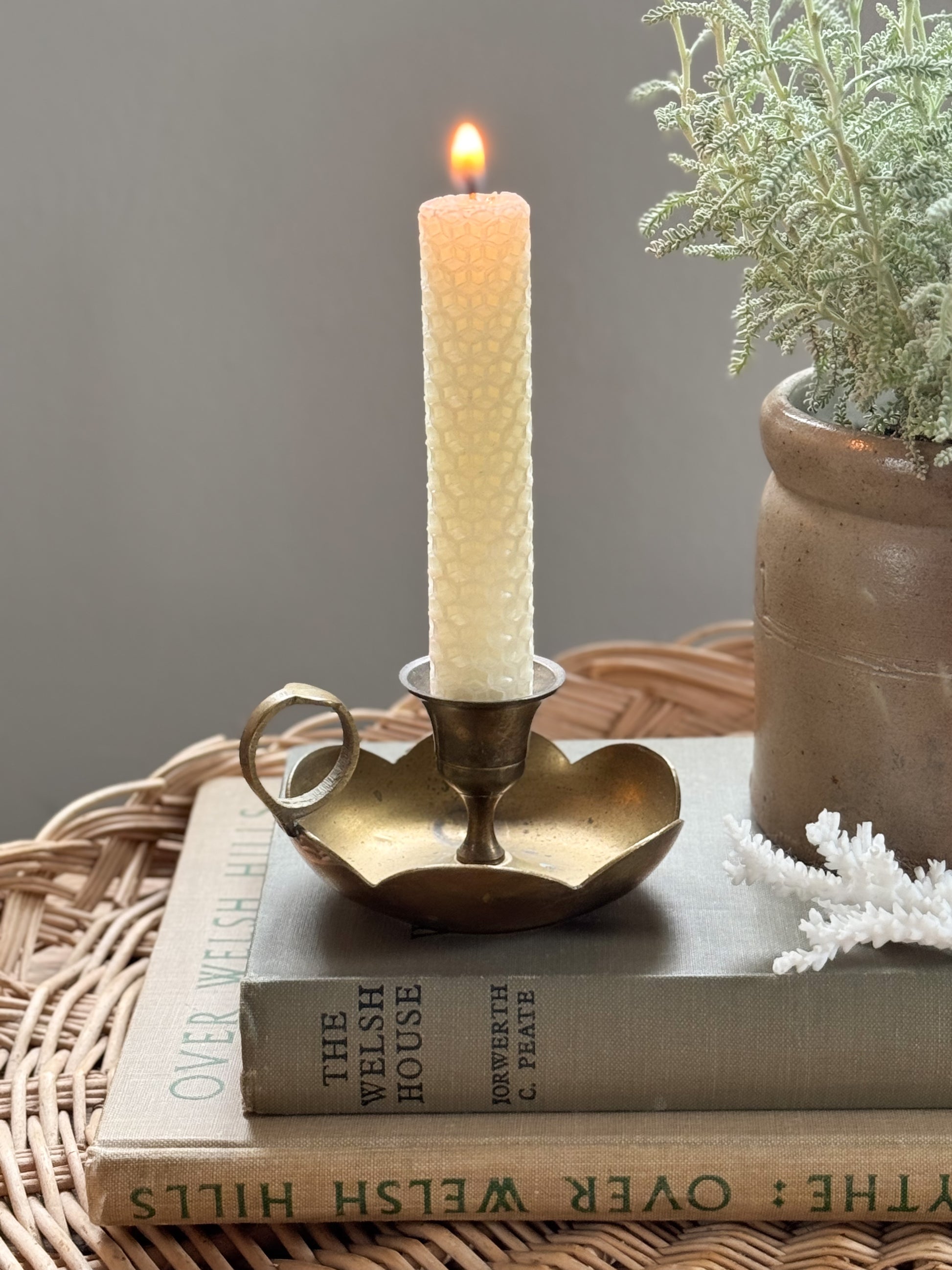 A beautiful vintage solid brass chamberstick with a softly scalloped dish and simple rounded handle. Its warm, time-worn patina tells of evenings lit by candlelight, carried from room to room before the convenience of electricity.