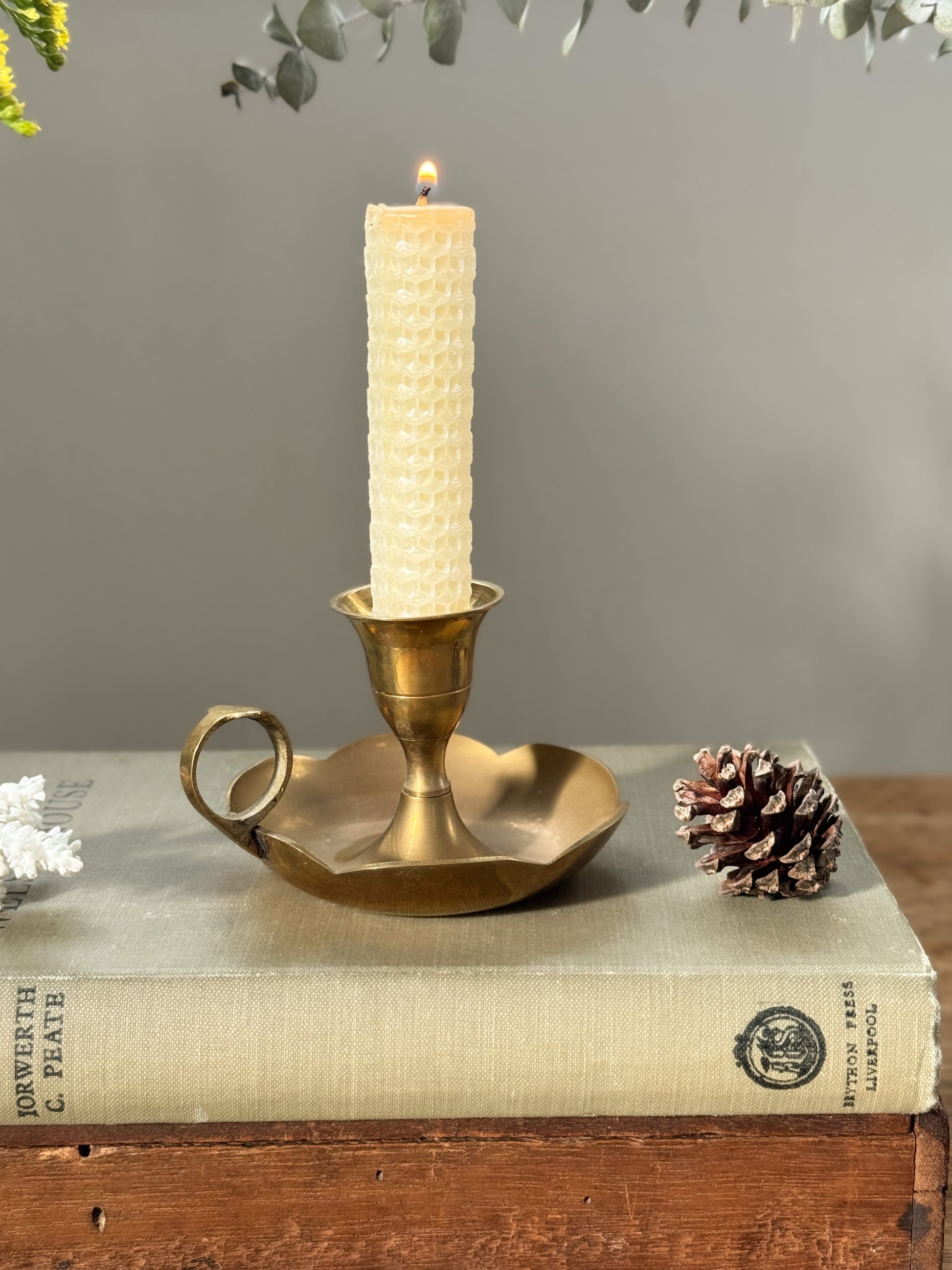 A beautiful vintage solid brass chamberstick with a softly scalloped dish and simple rounded handle. Its warm, time-worn patina tells of evenings lit by candlelight, carried from room to room before the convenience of electricity.