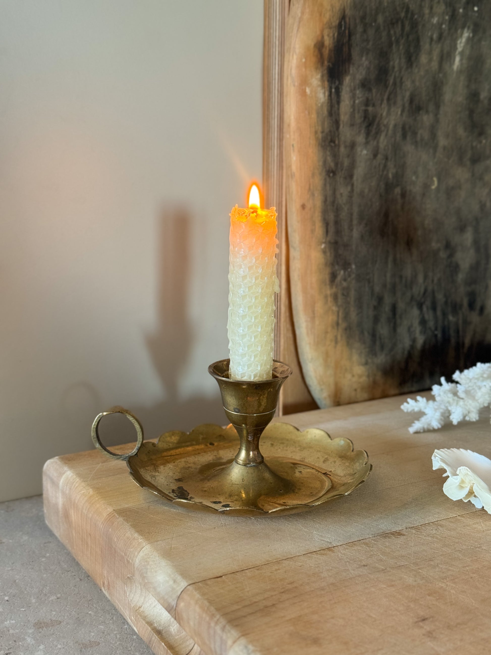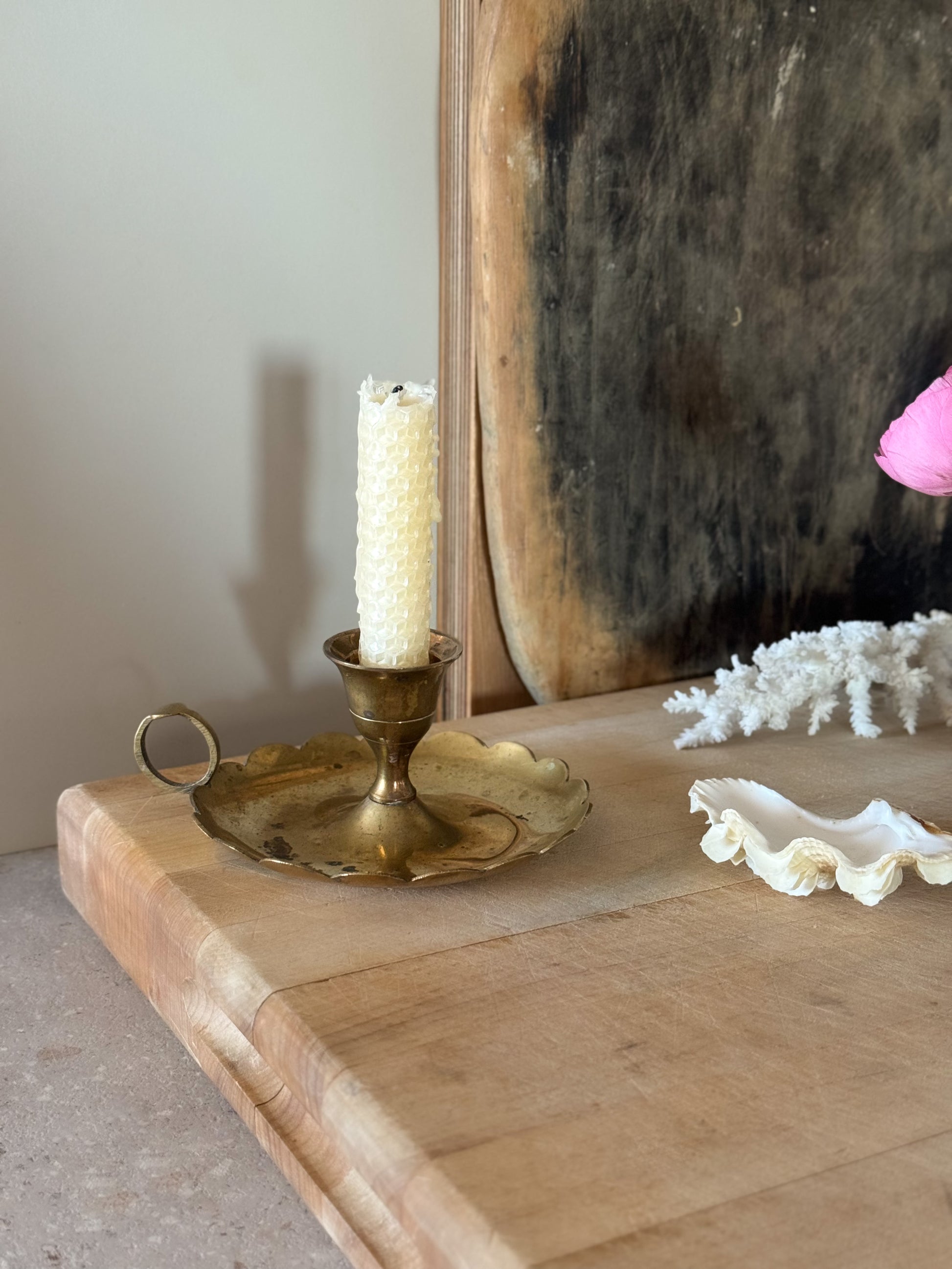 A beautiful vintage solid brass chamberstick with a scalloped edge and curved handle, a classic design that feels both functional and romantic. Its wide dish base makes it perfect for carrying or for safely catching wax drips, while the scalloped detailing softens the form, adding a touch of timeless charm.
