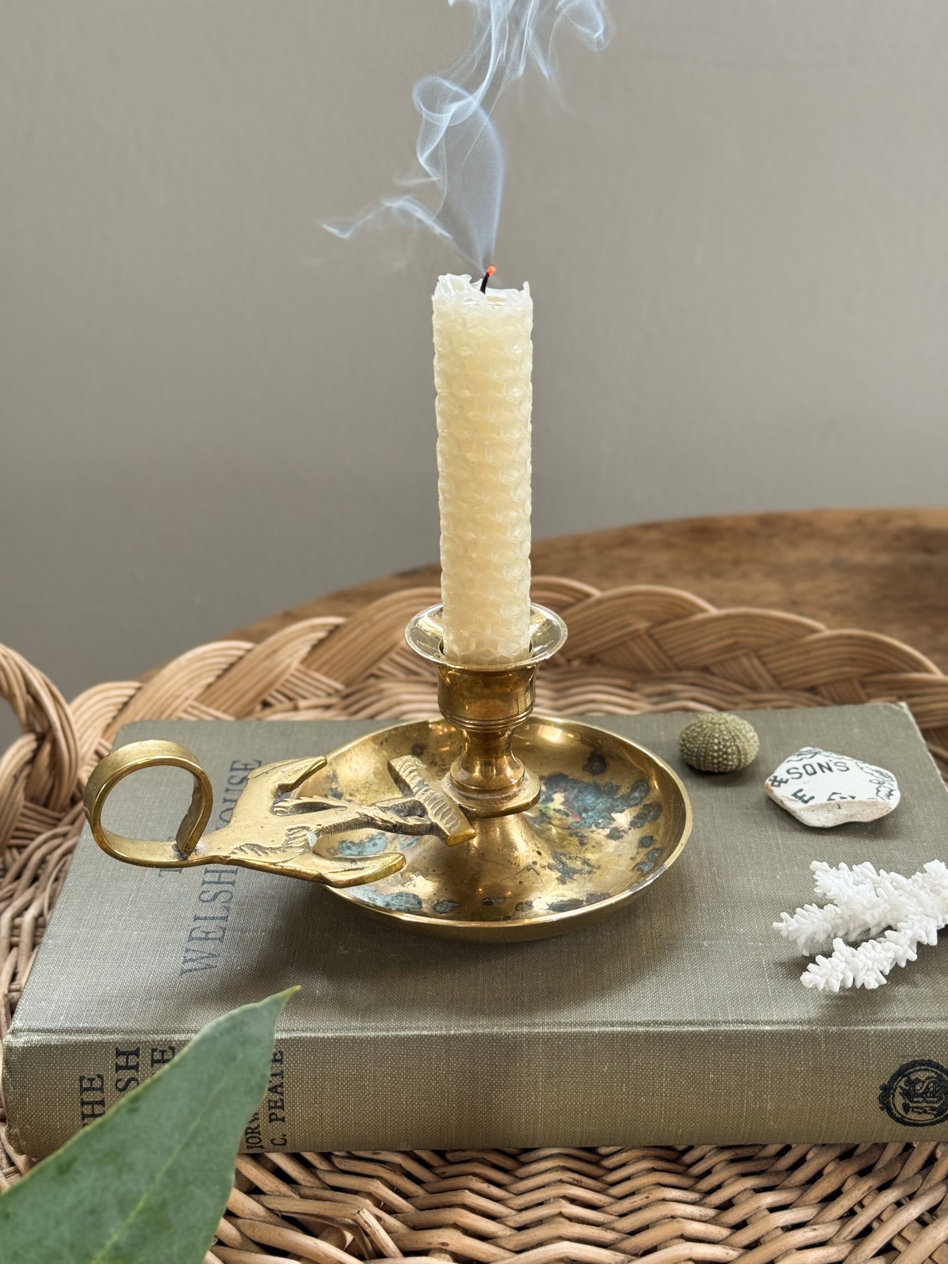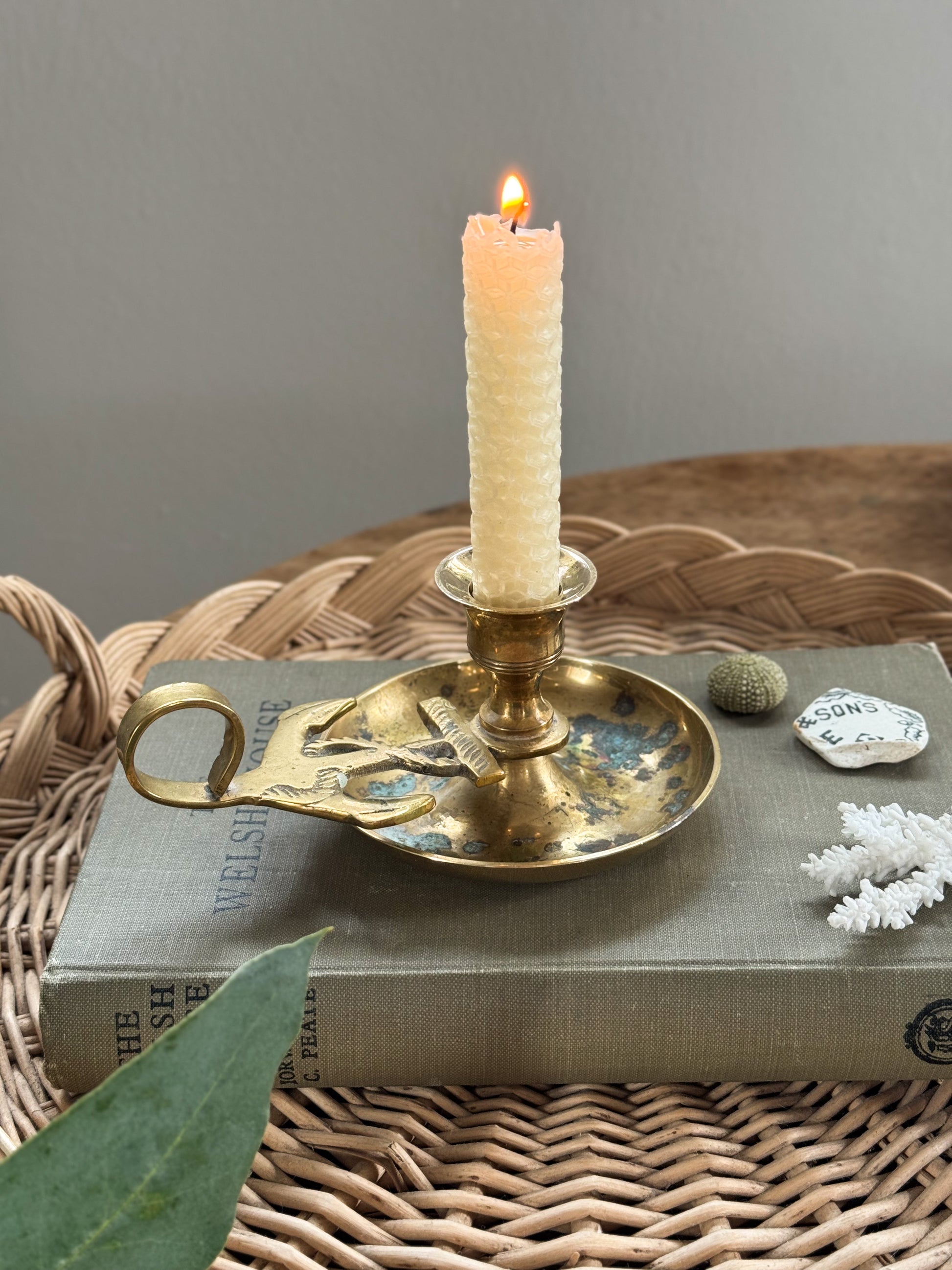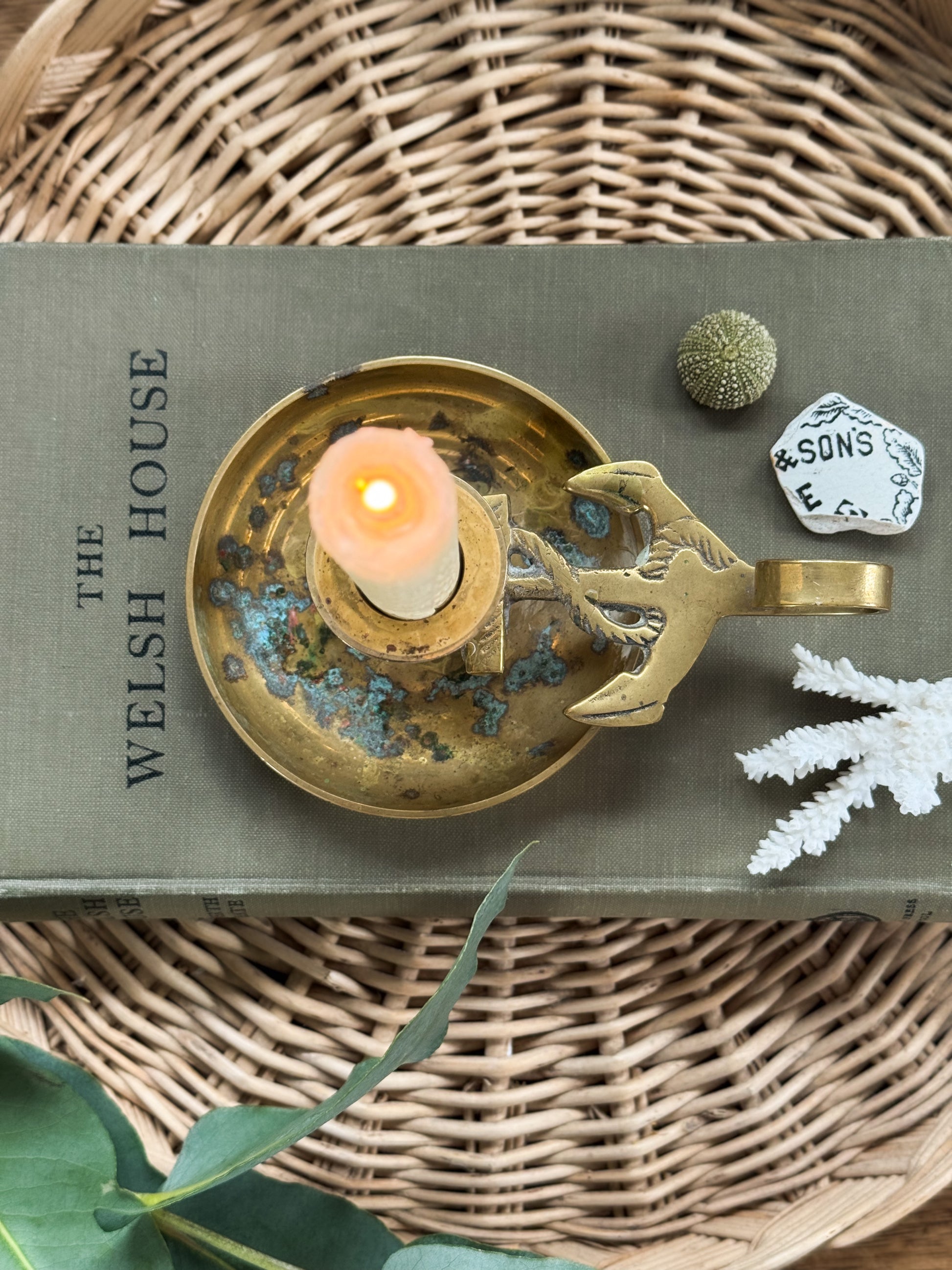A beautifully aged solid brass chamberstick featuring a ship’s anchor handle, a truly charming nautical piece with the most wonderful natural verdigris patina that tells its story. The surface has aged gracefully over time, creating a painterly mix of deep sea-green and warm golden tones.