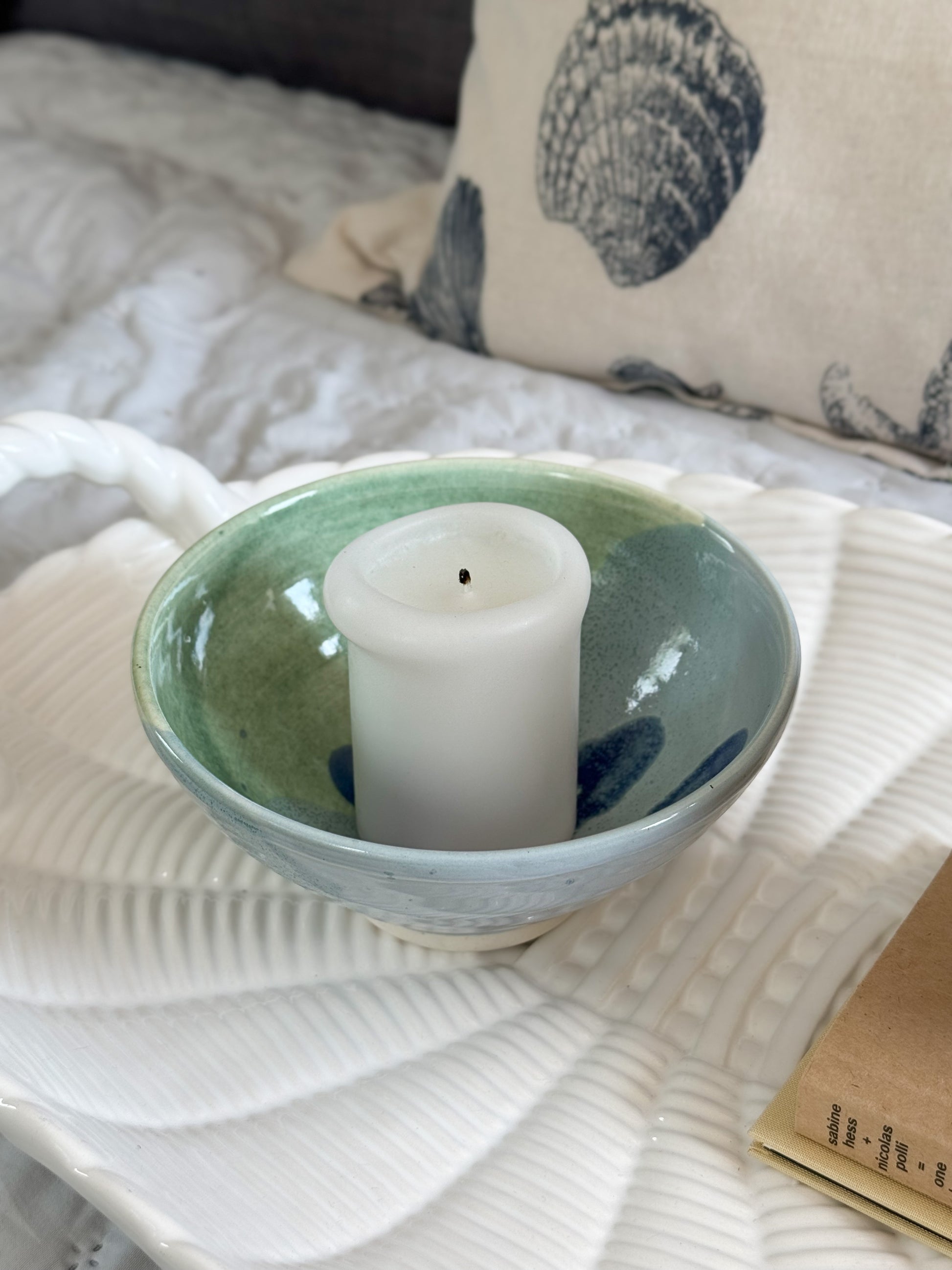 The interior is a painterly canvas of cool green and soft sky blue, overlaid with bold, inky sweeps of cobalt that flow organically across the surface. The glossy glaze has a beautiful texture and depth, with subtle variations that reveal the potter’s skill and the alchemy of the kiln. The exterior echoes the gentle green and blue tones, grounding the design with an understated elegance.