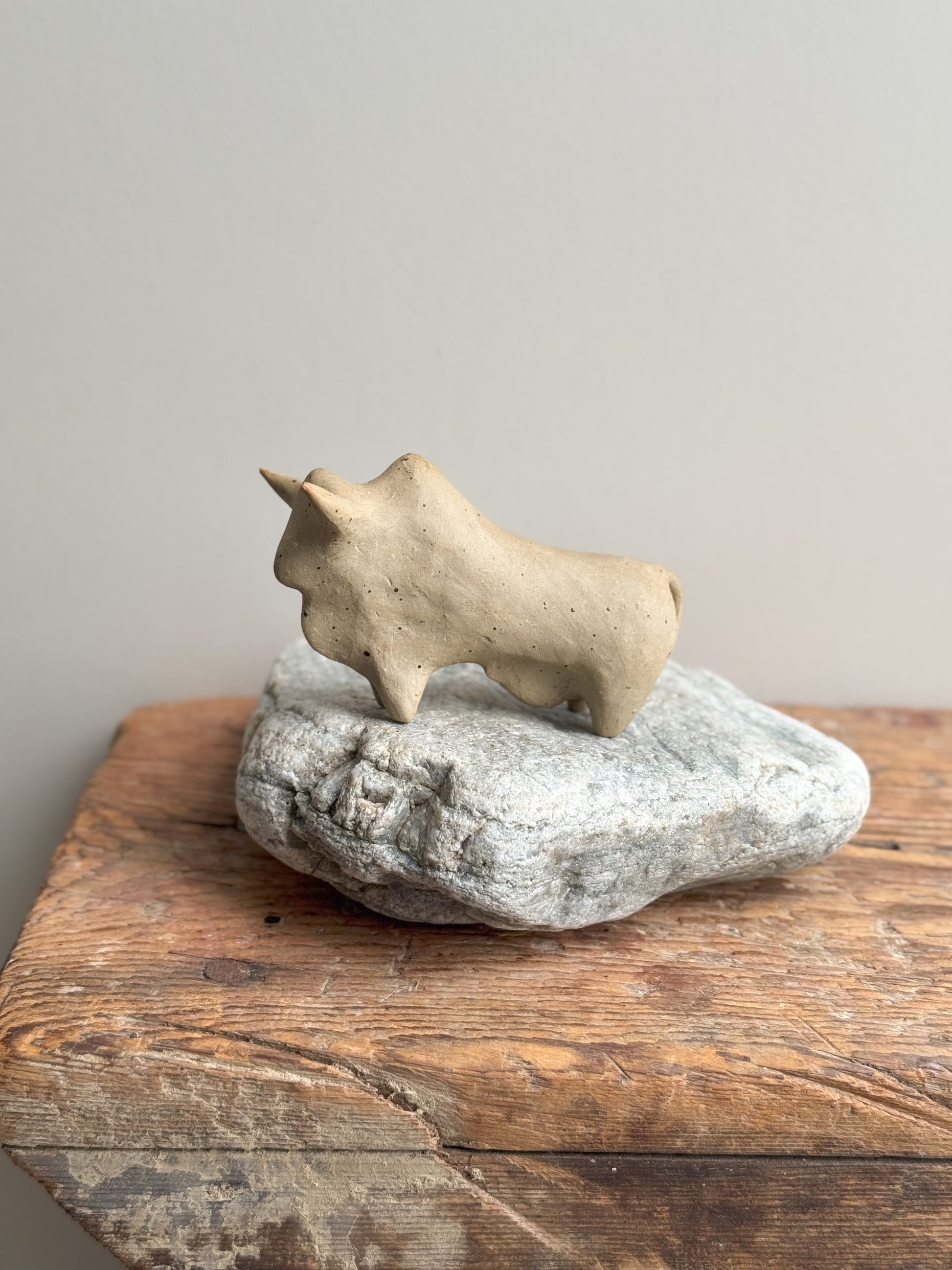 A beautiful minimalist studio pottery bull sculpture. This subtle piece is so tactile and the curves of the silhouette are very satisfying to look at. It has the most stunning little salt glazed specks throughout!