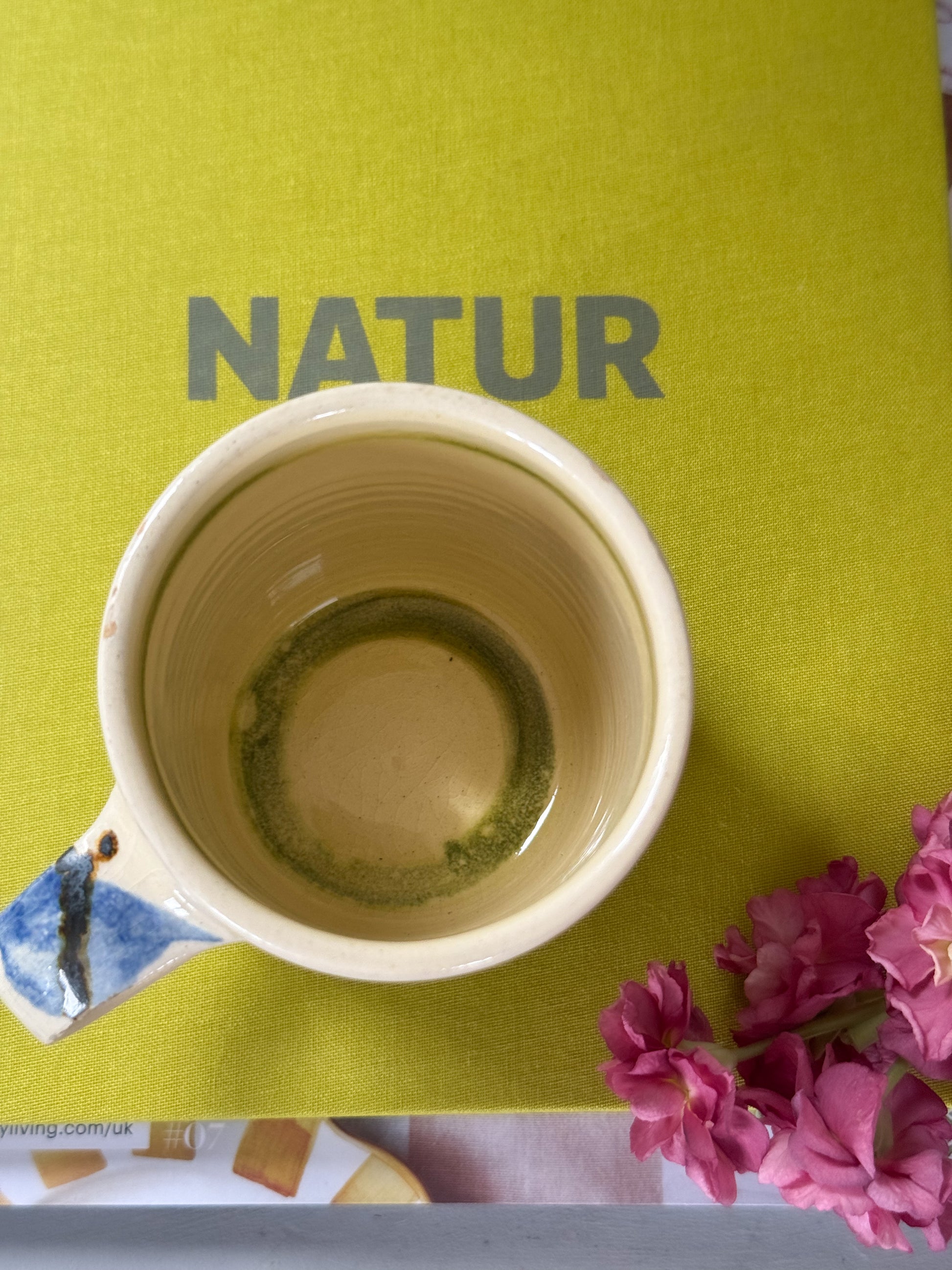 A truly charming studio pottery mug, hand-thrown and decorated with painterly blue butterflies in flight. The cream glaze provides a soft base, while accents of rich cobalt blue, mossy green, and earthy brown bring the delicate motif to life. The butterflies appear almost mid-motion, with expressive brushstrokes that lend the piece a sense of movement and spontaneity.