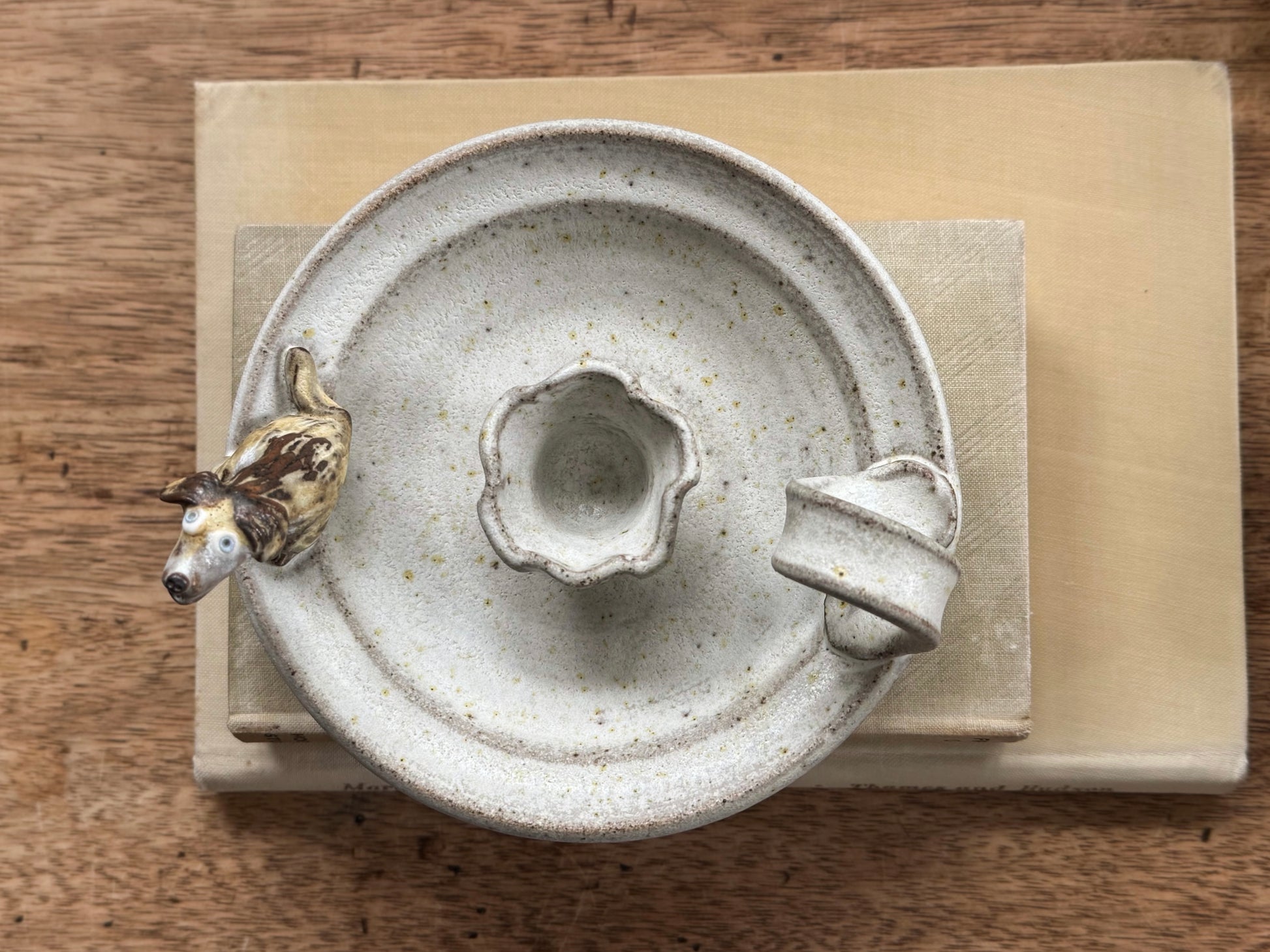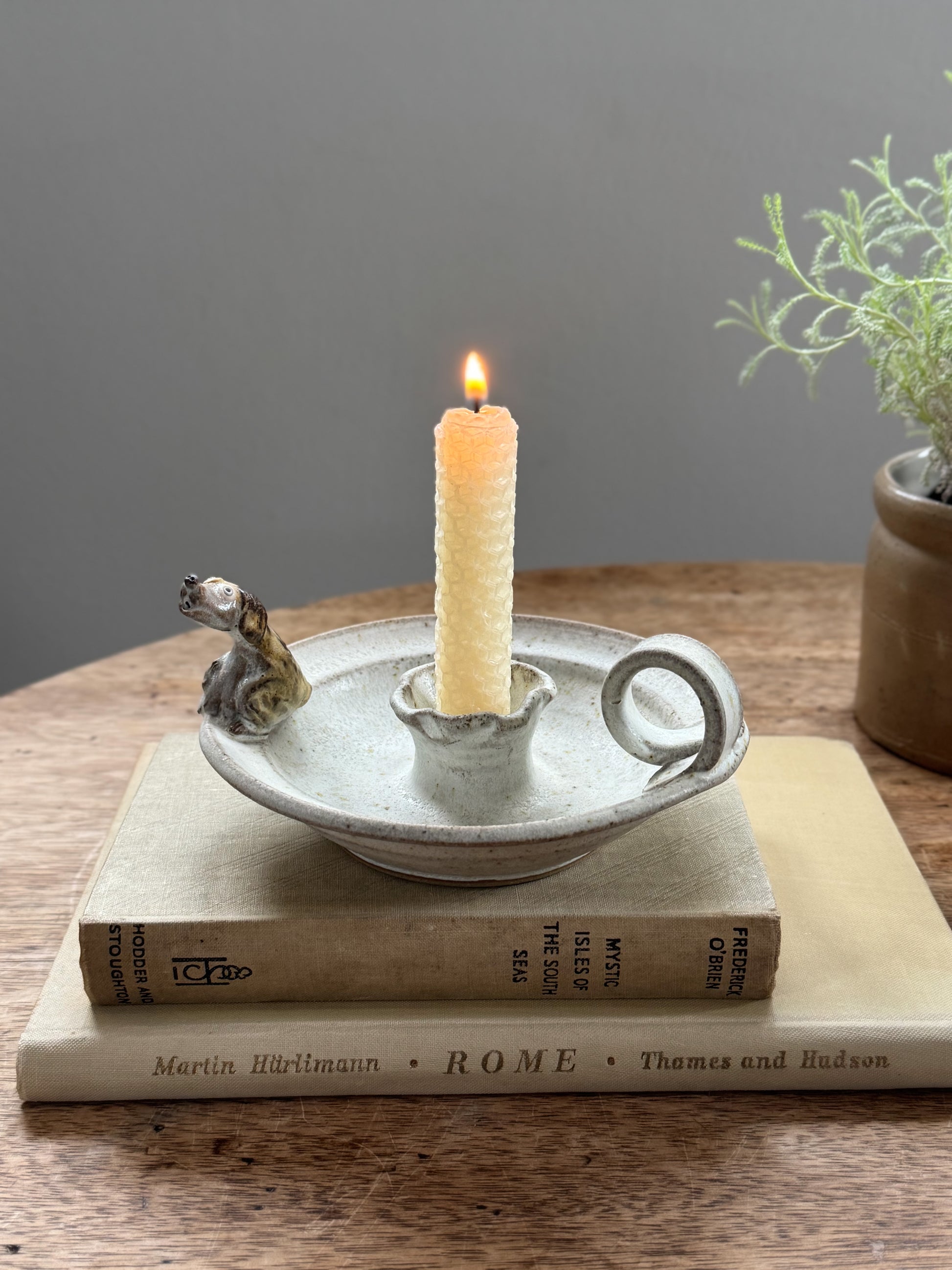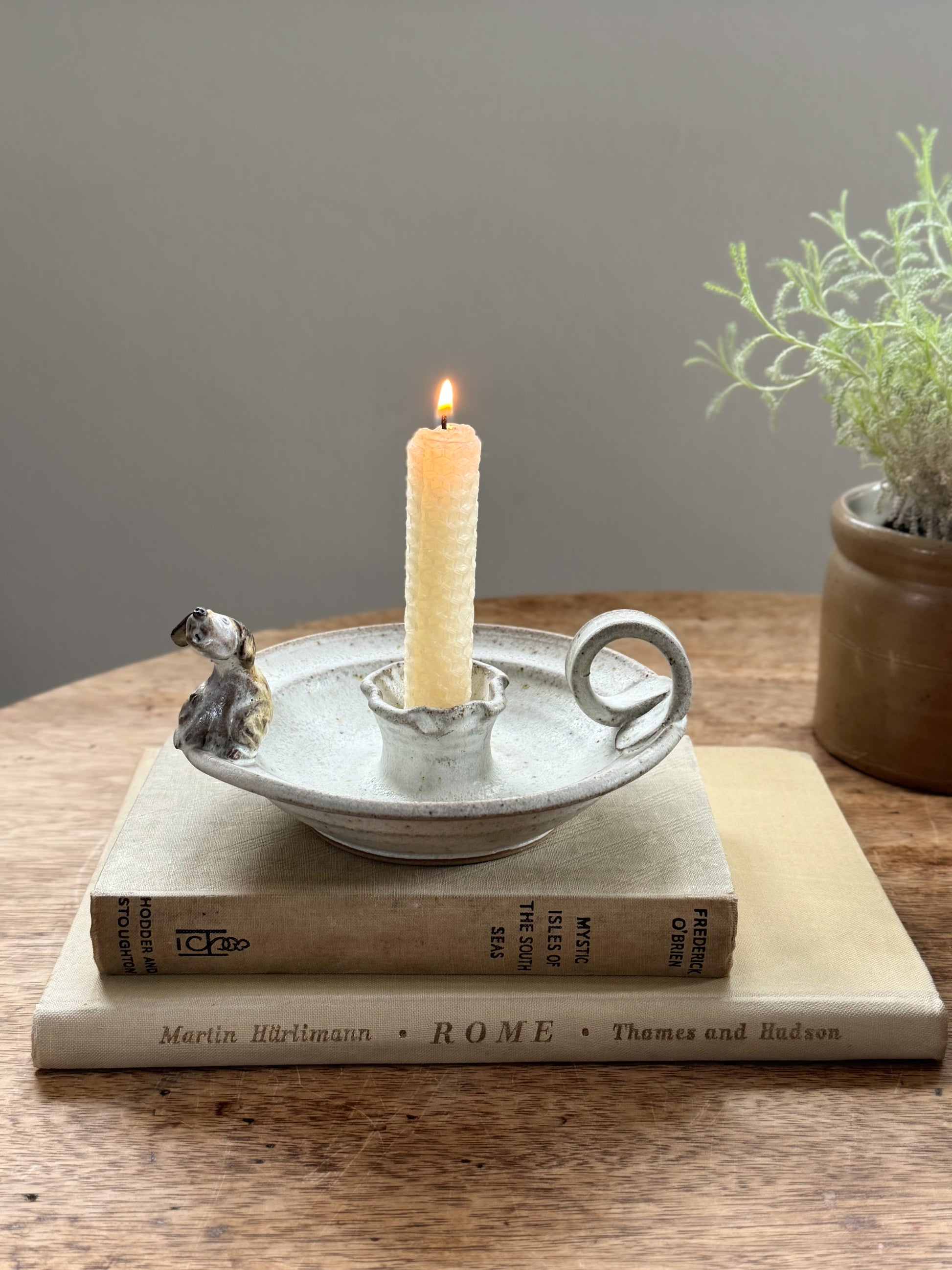 A truly one-of-a-kind studio pottery chamberstick, full of charm and personality. Hand-thrown in a softly speckled glaze of white and subtle beige tones, it features a beautifully scalloped candle holder, a twisted loop handle, and the sweetest little dog perched at its edge, watching the candlelight flicker.