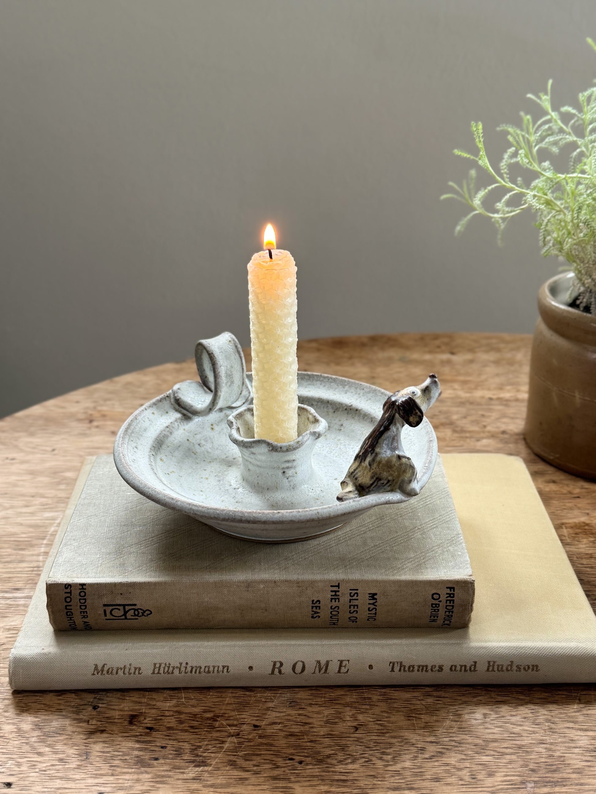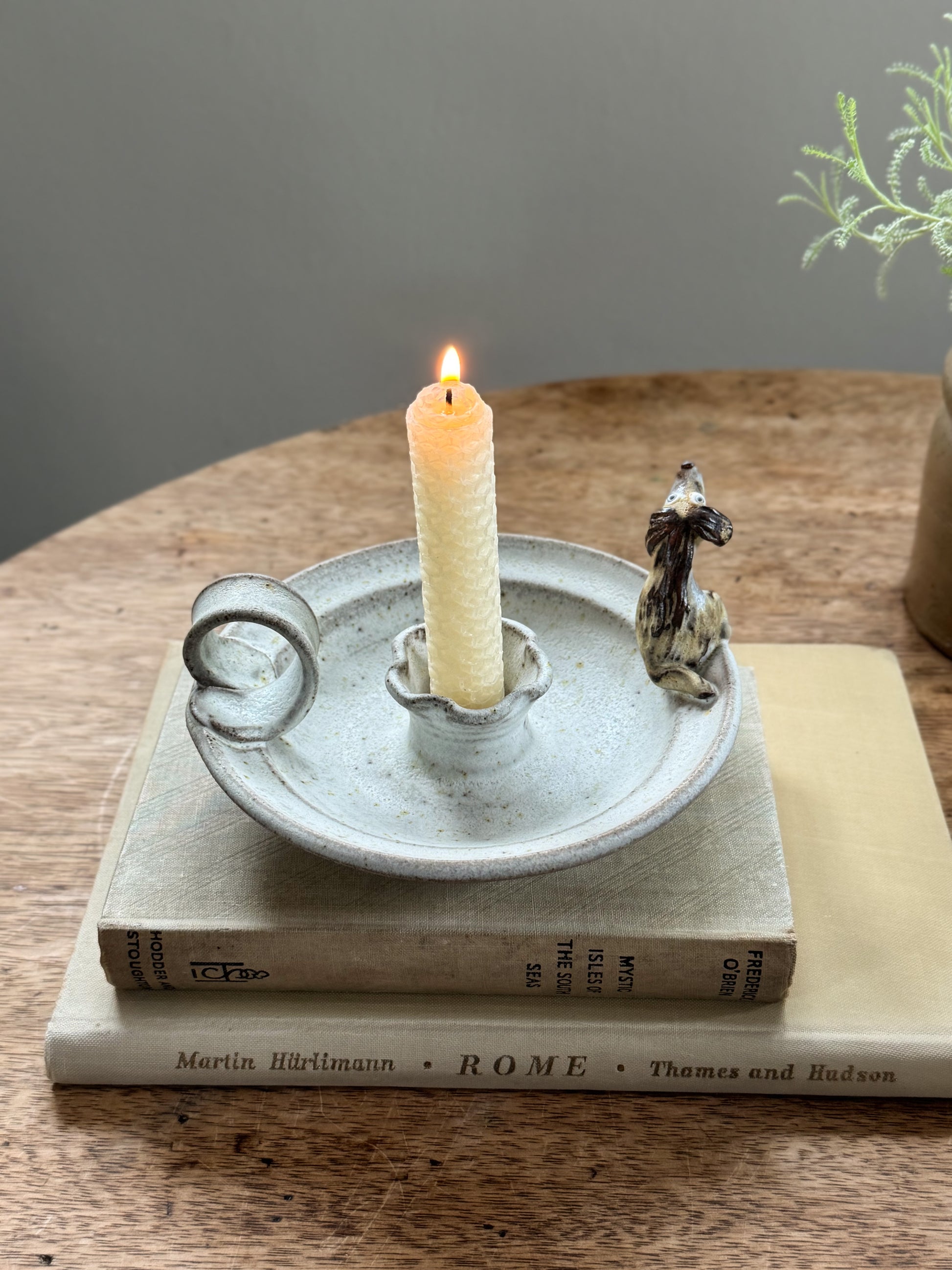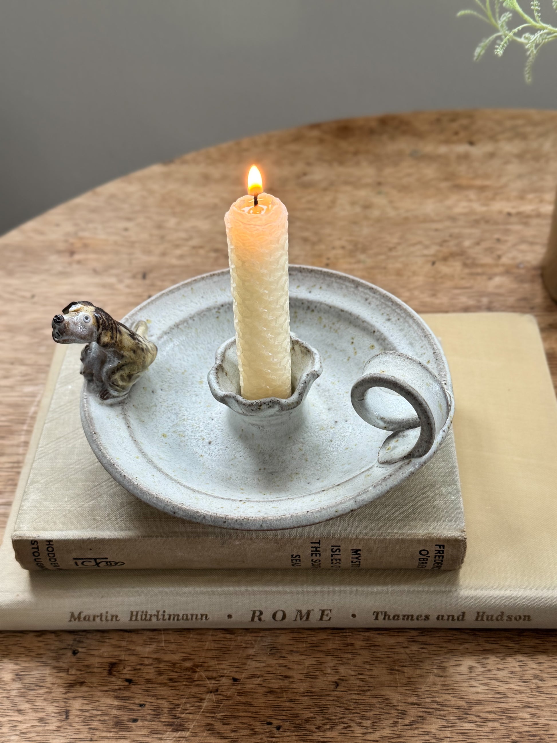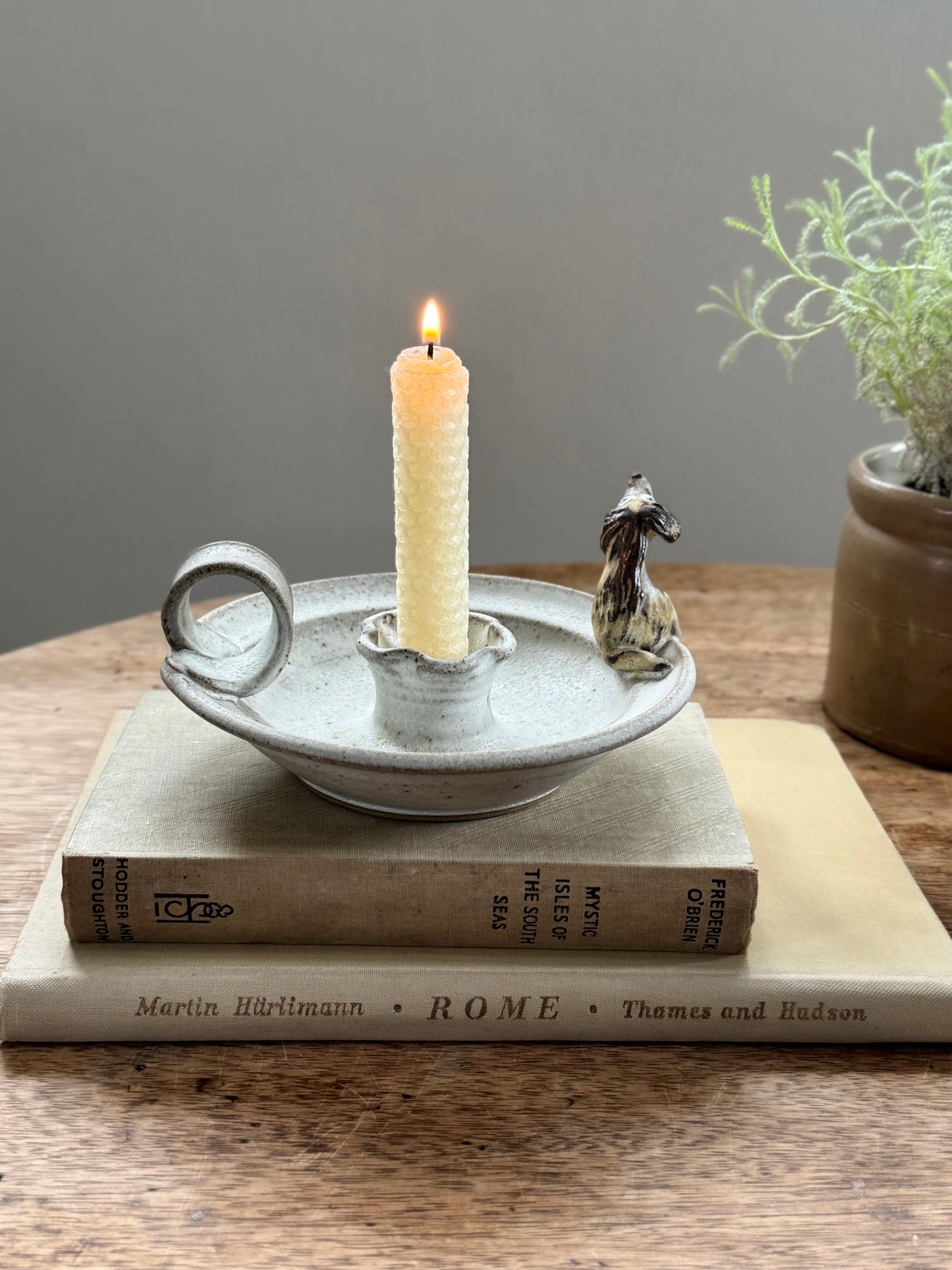 A truly one-of-a-kind studio pottery chamberstick, full of charm and personality. Hand-thrown in a softly speckled glaze of white and subtle beige tones, it features a beautifully scalloped candle holder, a twisted loop handle, and the sweetest little dog perched at its edge, watching the candlelight flicker.
