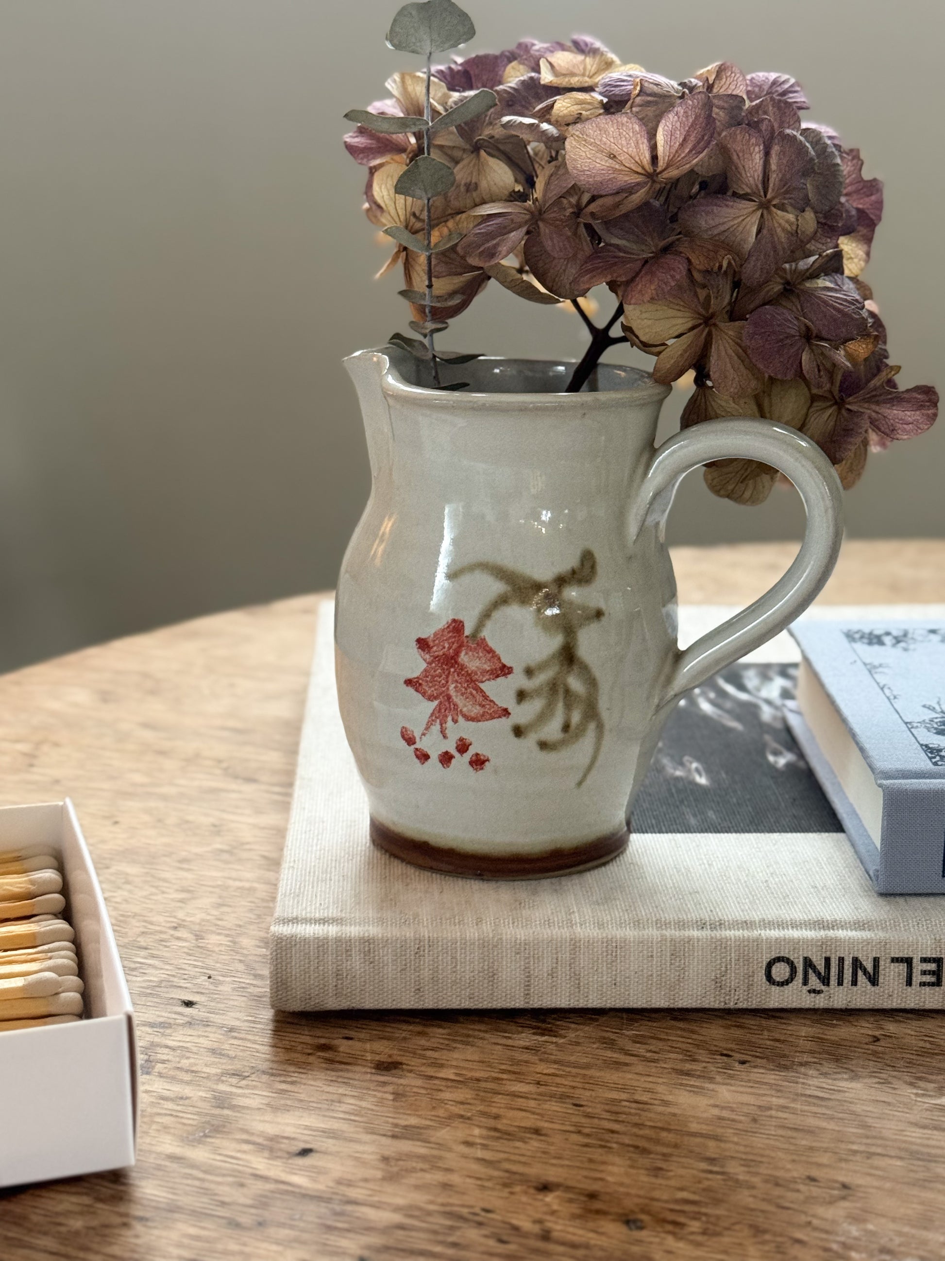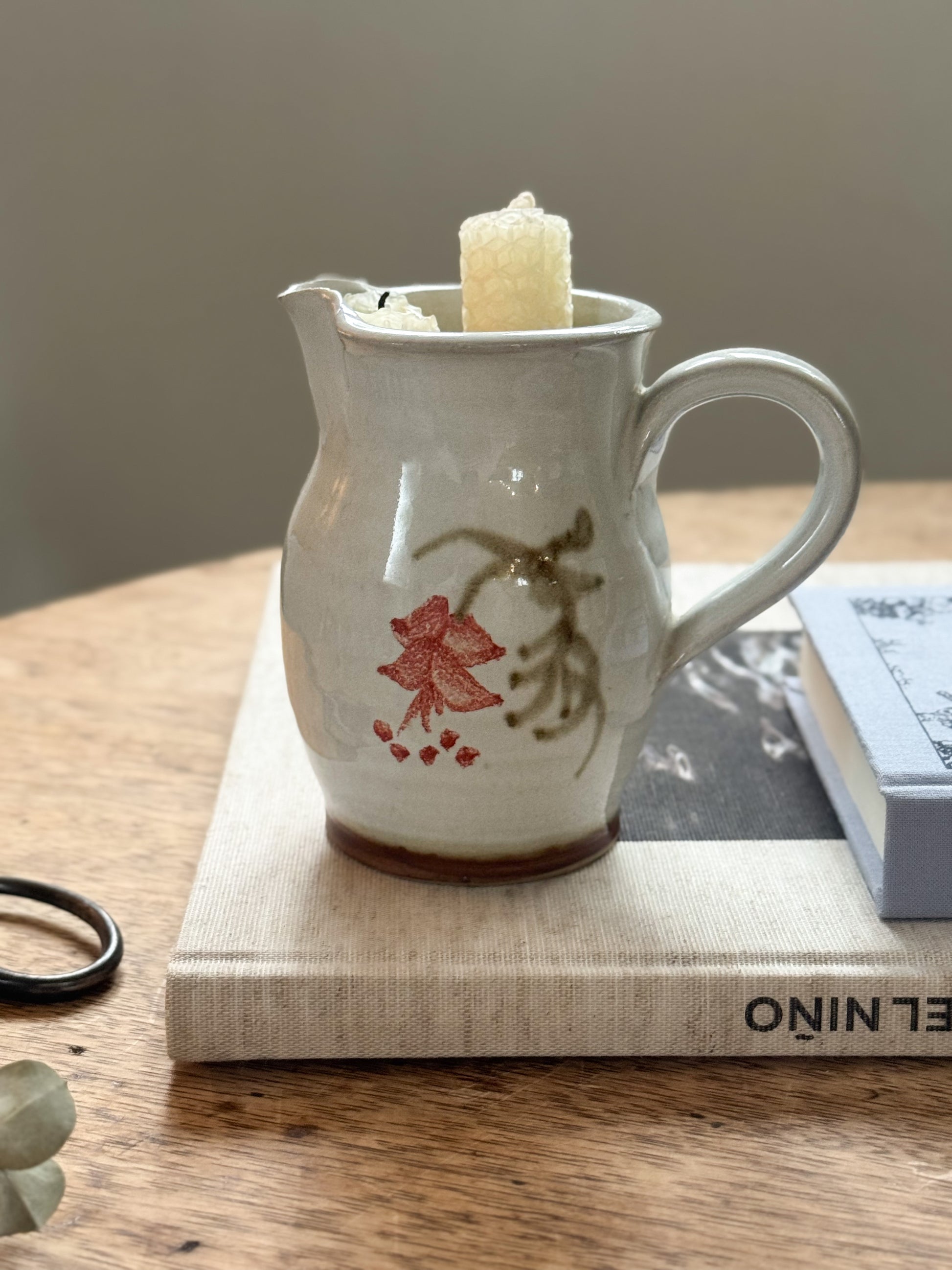A truly charming piece by Glenshee Pottery, this hand-thrown jug features a delicate painterly fuchsia motif in soft red and earthy olive tones. Its organic form, gentle curves and subtly speckled glaze give it a warmth and character that feels right at home in any cosy, curated corner.
