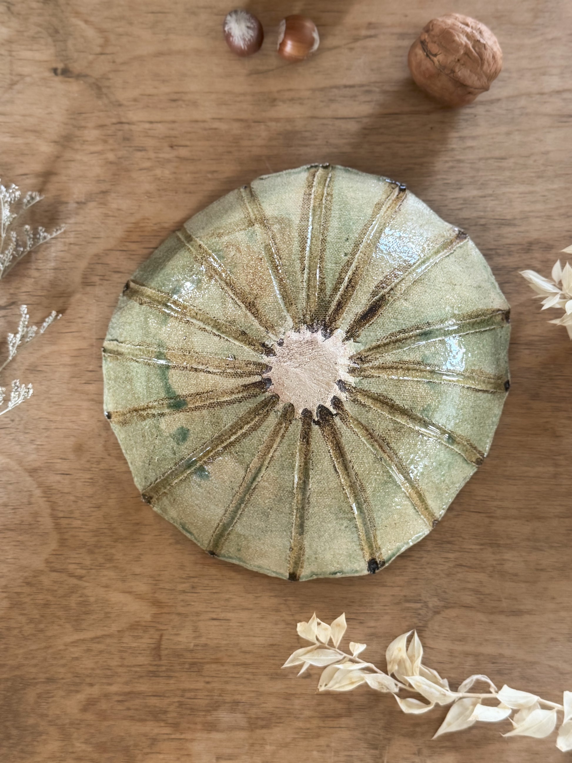 This incredible studio pottery bowl is delicate and intricately made, it has the most beautiful texture, with a subtle olive green glaze and a fern leaf in its centre that has been created using the impression of a real fern sprig. It has the most wonderful drip glaze on the base too! A perfectly unique piece.