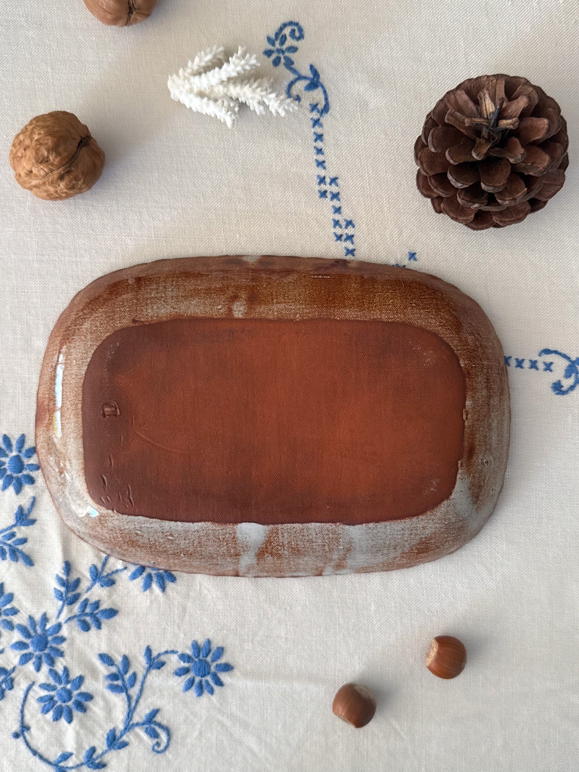 Made from terracotta clay with a natural slip glaze, this dish carries that perfect balance of rustic character and quiet artistry. Its flat, rectangular form makes it wonderfully versatile, use it as a serving dish for nuts or sweet treats, a trinket holder, or this would be particularly beautiful displayed on the wall as part of a gallery arrangement.