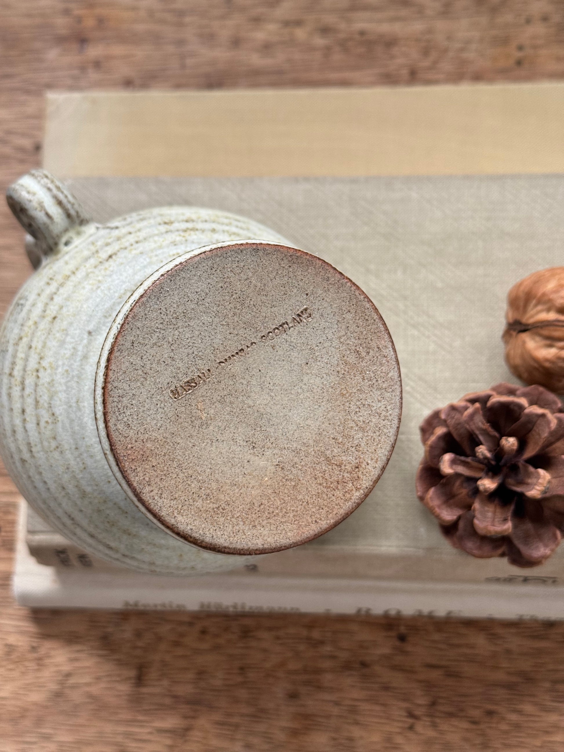 A beautifully balanced vintage studio pottery chamberstick, hand-thrown and stamped Hassall Dunbar, Scotland. Its soft oatmeal glaze and gently speckled surface give it a timeless, rustic charm, while the pedestal base and looped handle add both grace and functionality, a nod to traditional candlelight rituals.