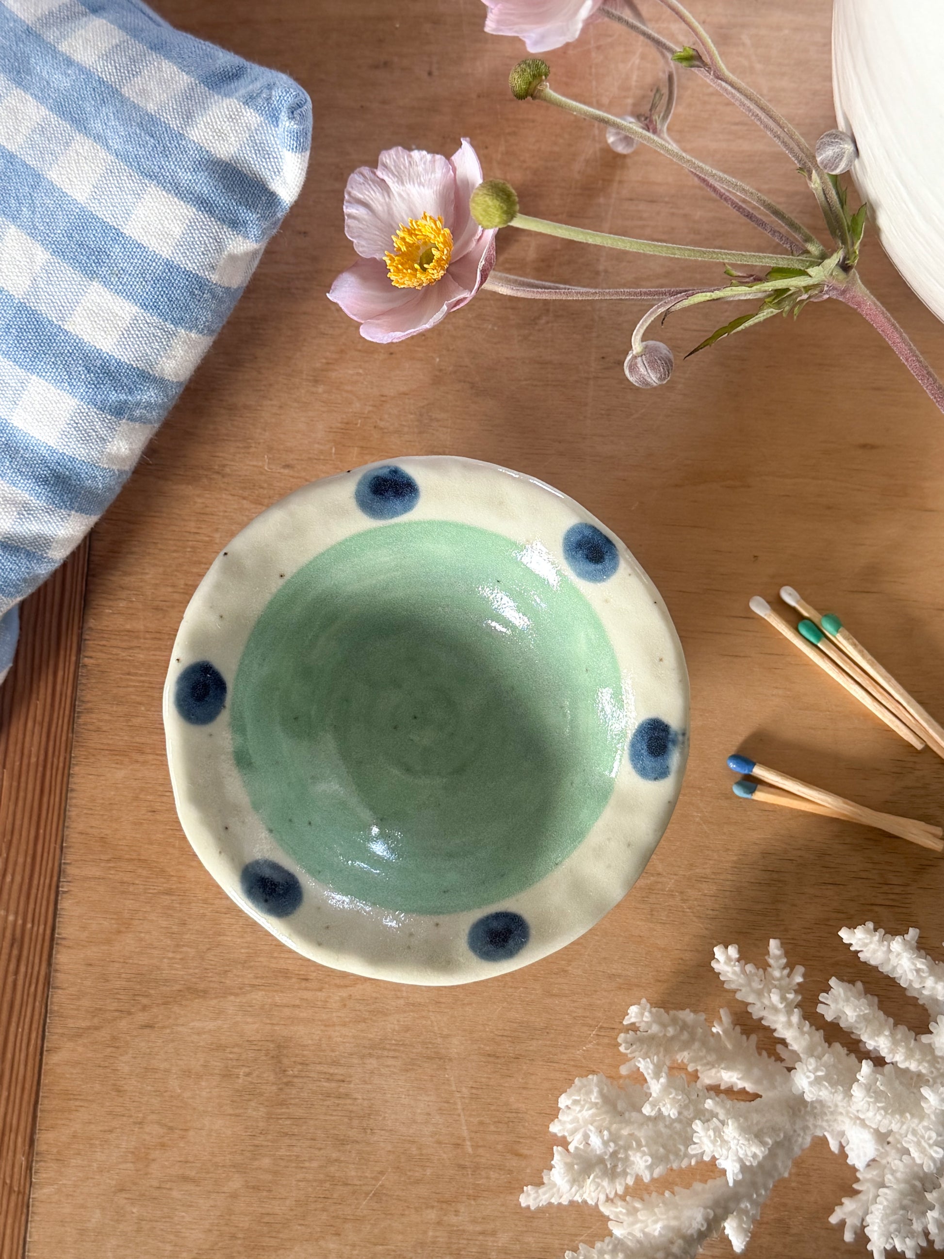 Its softly irregular form and gentle curve feel beautiful in the hand, while the dreamy glaze, a wash of pale green in the centre, creamy speckled clay around the edges, and deep inky blue polka dots, makes it quietly magical. Beautifully earthy, playful yet elegant.