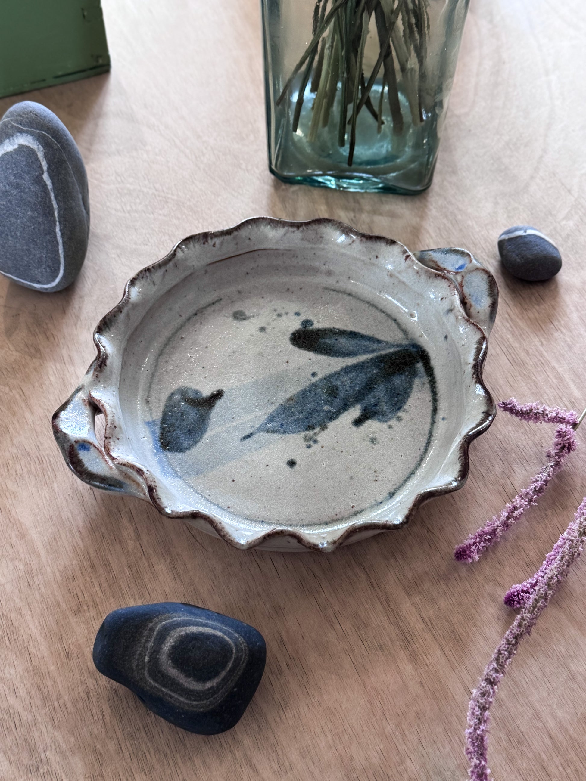 The scalloped edge gives it such a lovely rhythm, and the two small looped handles make it feel almost like a miniature serving dish from a cottage kitchen. The rim has that slightly darker, toasted edge where the glaze has pooled, a detail I always love. This is a beautiful piece for serving but would also make a wonderful wall plate.