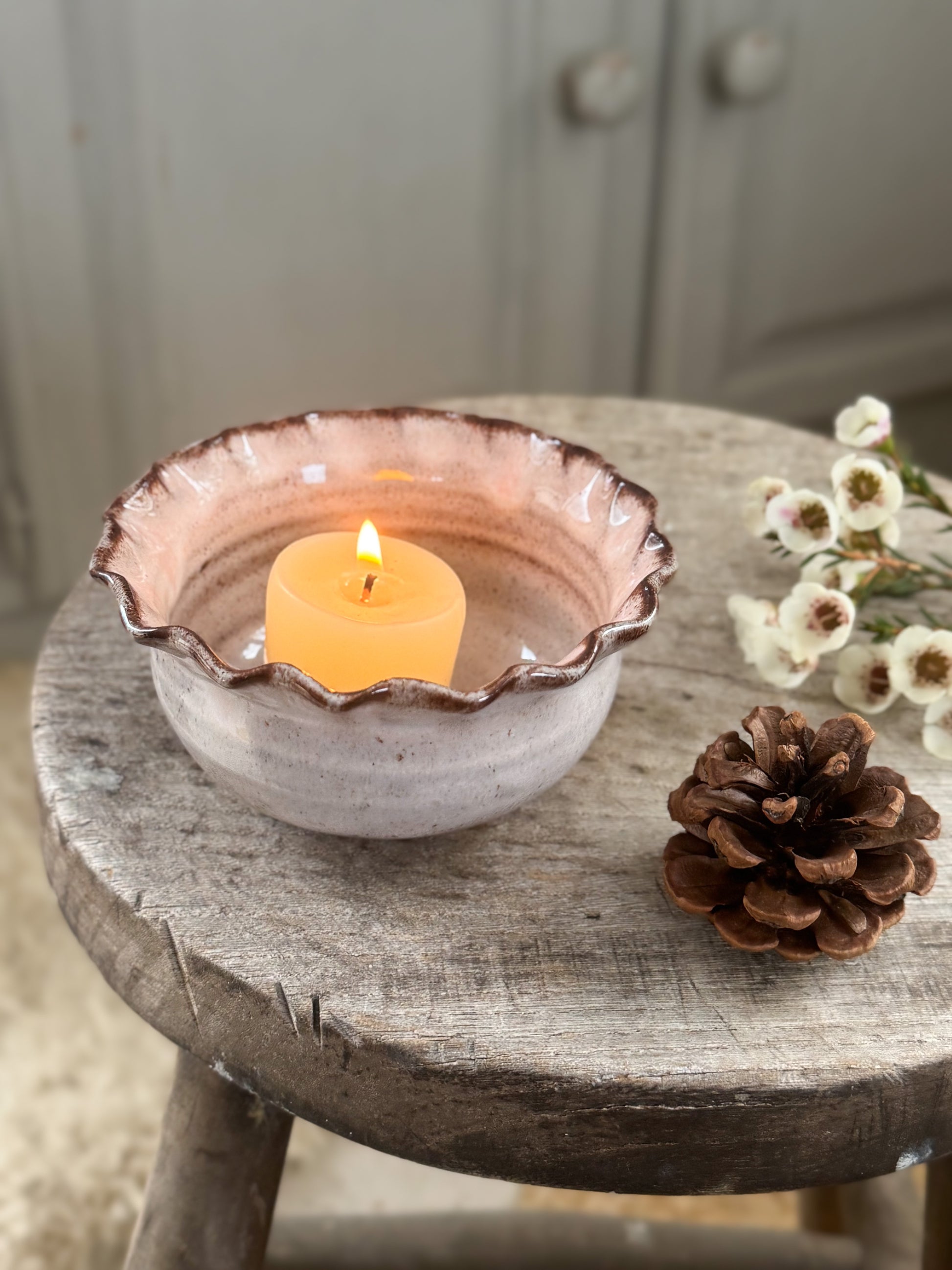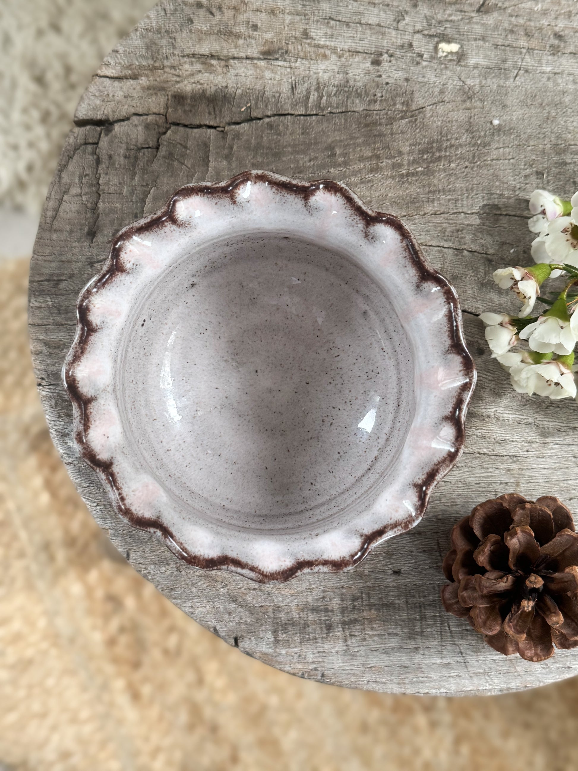 This bowl features a softly fluted, scalloped rim and a delicate speckled glaze in pale grey with a rich brown edge, a timeless design that feels both rustic and refined. Its versatile form makes it perfect for everyday use or as a decorative accent: style it as a a trinket dish, or, as we’ve shown here, a simple yet striking holder for a pillar candle.