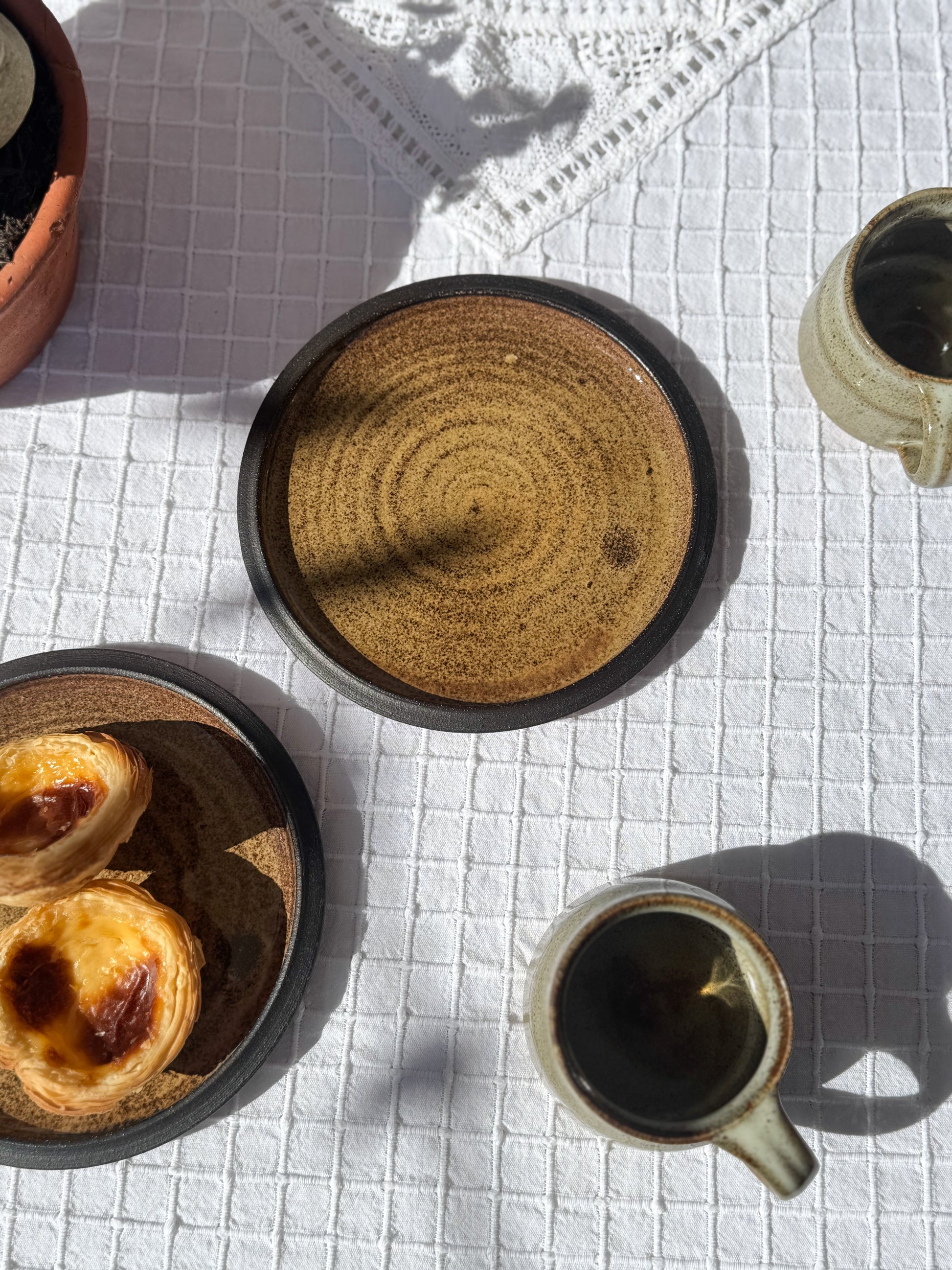 Each plate is one-of-a-kind, with subtle variations and speckling that speak to their hand-thrown origins. Perfect for pastries, fruit, or a slice of something sweet, they belong in slow brunches, shared stories, and rooms that feel lived in and loved.