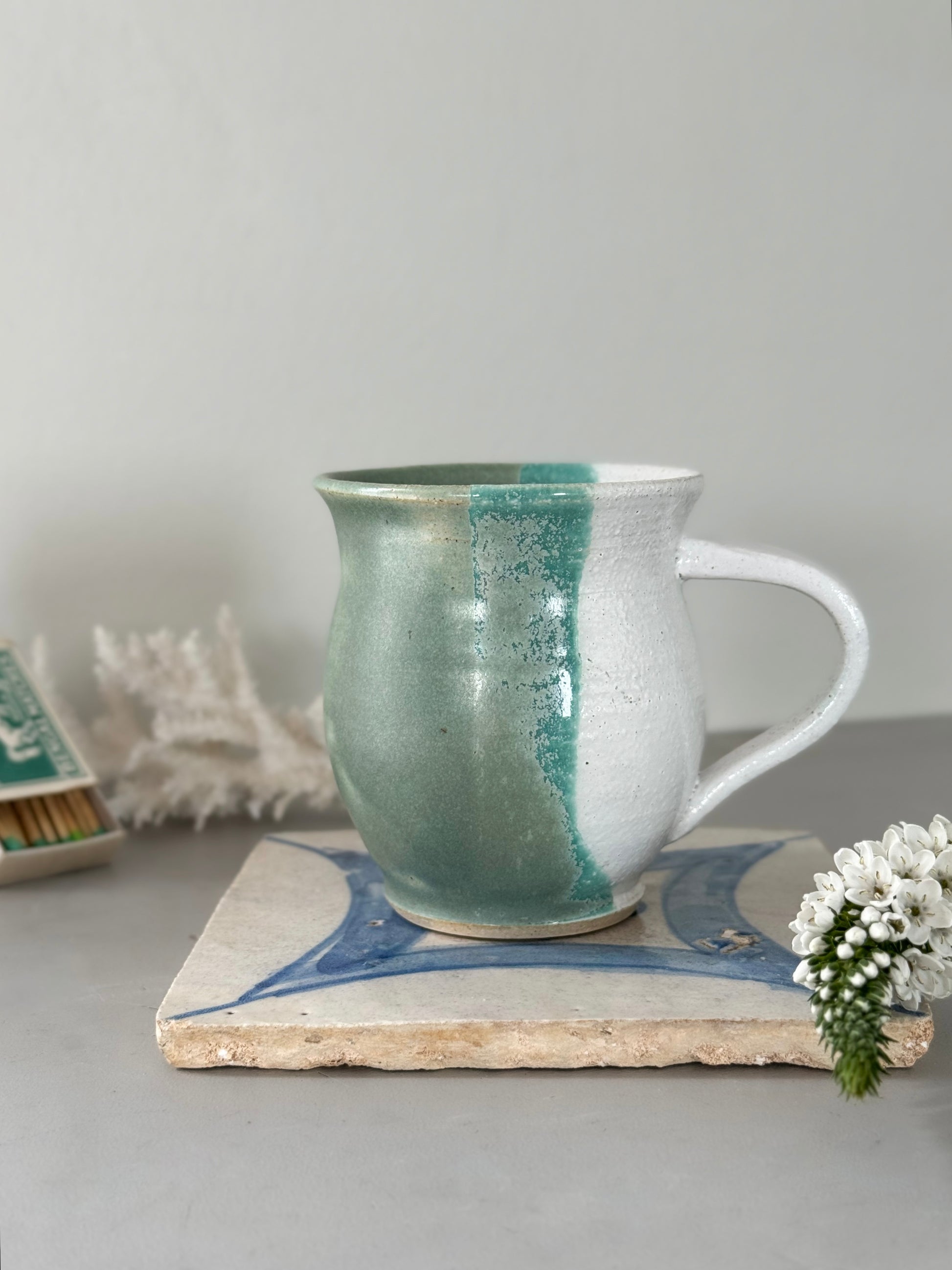 A beautifully balanced studio pottery mug, hand-thrown and finished in a tactile, split-glaze design. One half is a soft, matte sage green with subtle tonal variations, while the other is a warm off-white with a gentle speckle, joined by a ribbon of seafoam glaze that flows organically down the centre. The rounded belly, gently flared rim, and comfortable handle make it as pleasing to hold as it is to admire.