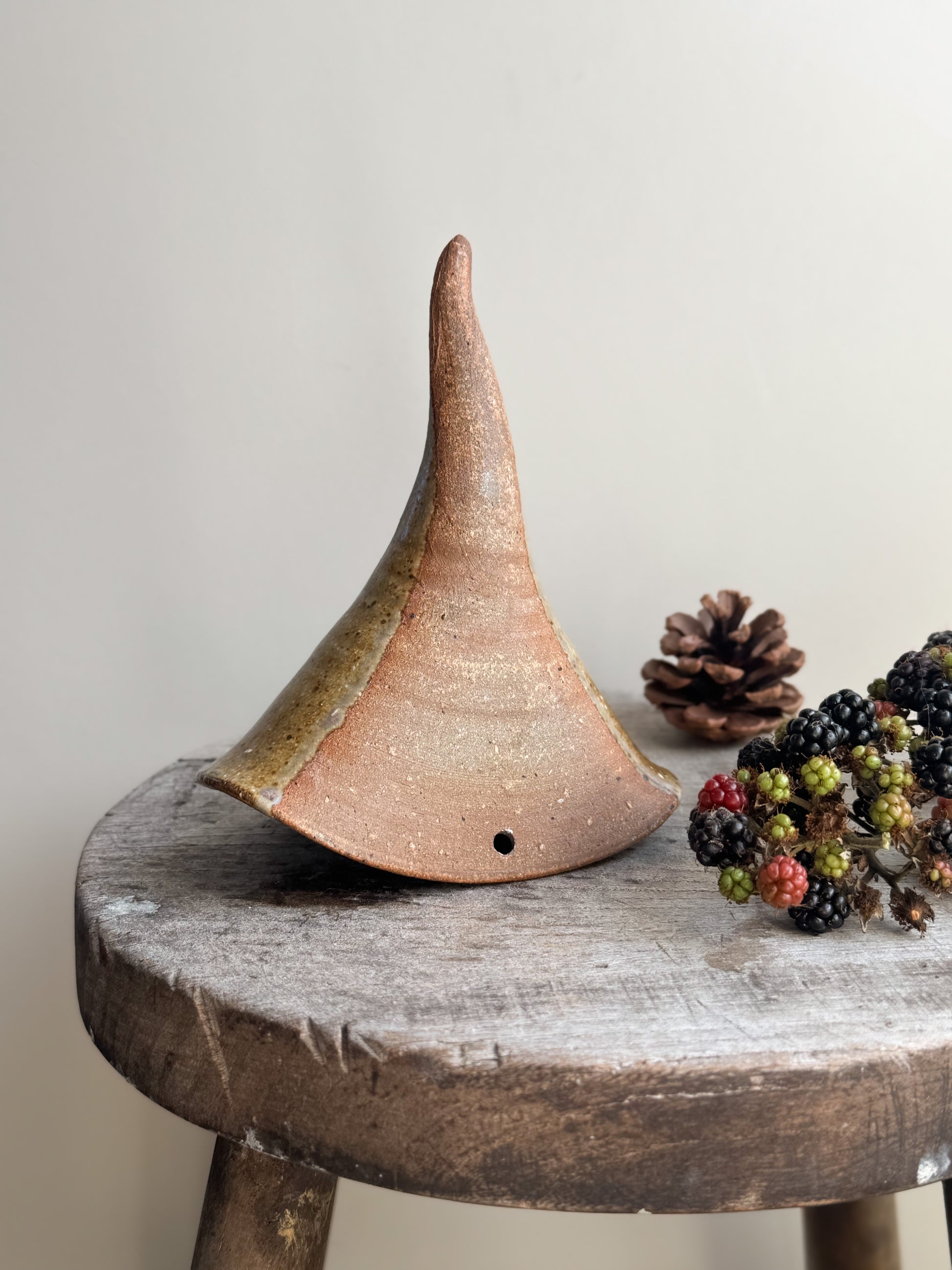 Perfect as a centrepiece surrounded by pinecones, berries, and candlelight, or hung on the wall filled with foraged foliage. Its handmade texture and rustic glaze make it feel timeless, while its playful, whimsical shape gives it a touch of folklore and storybook charm.
