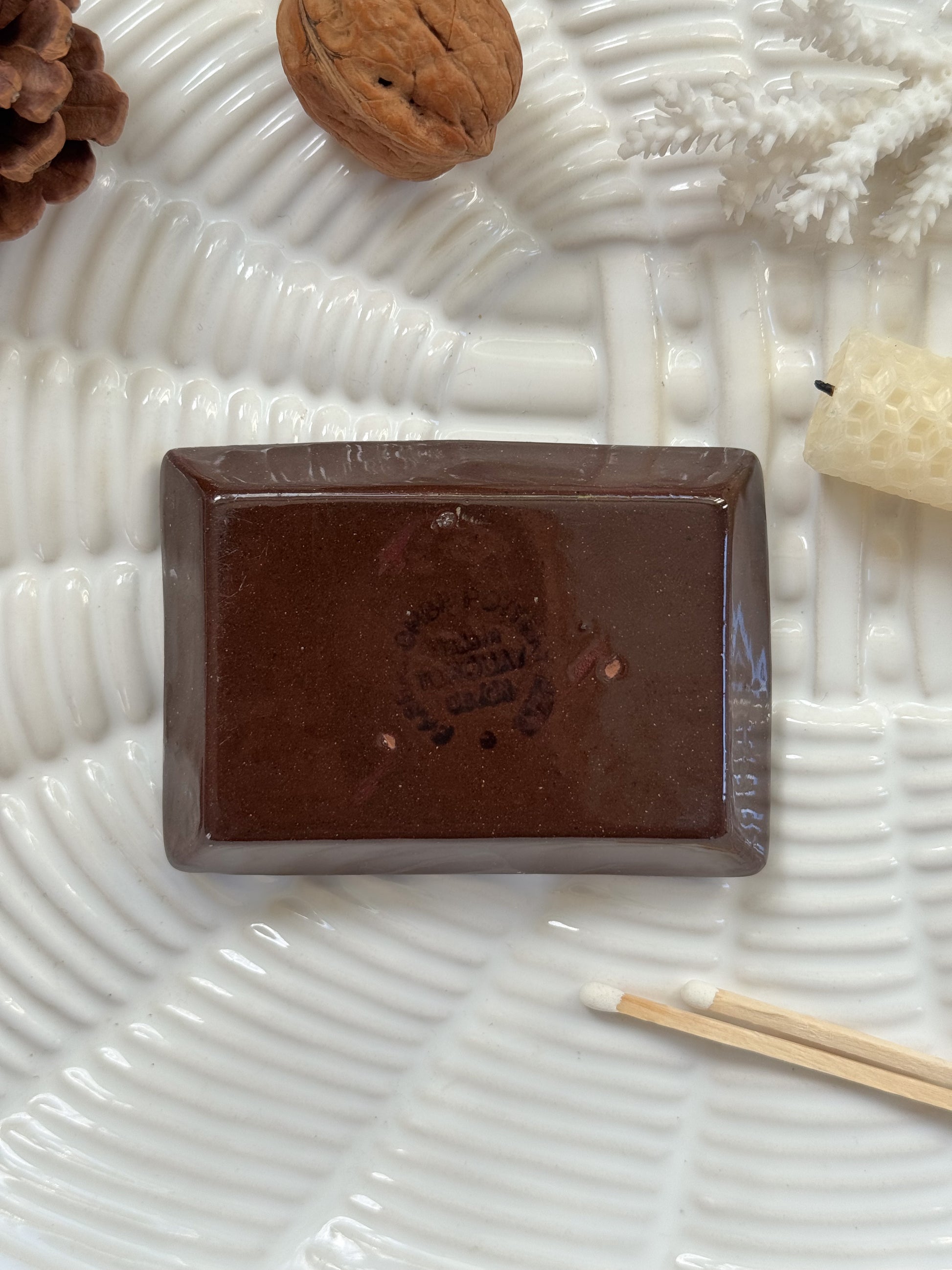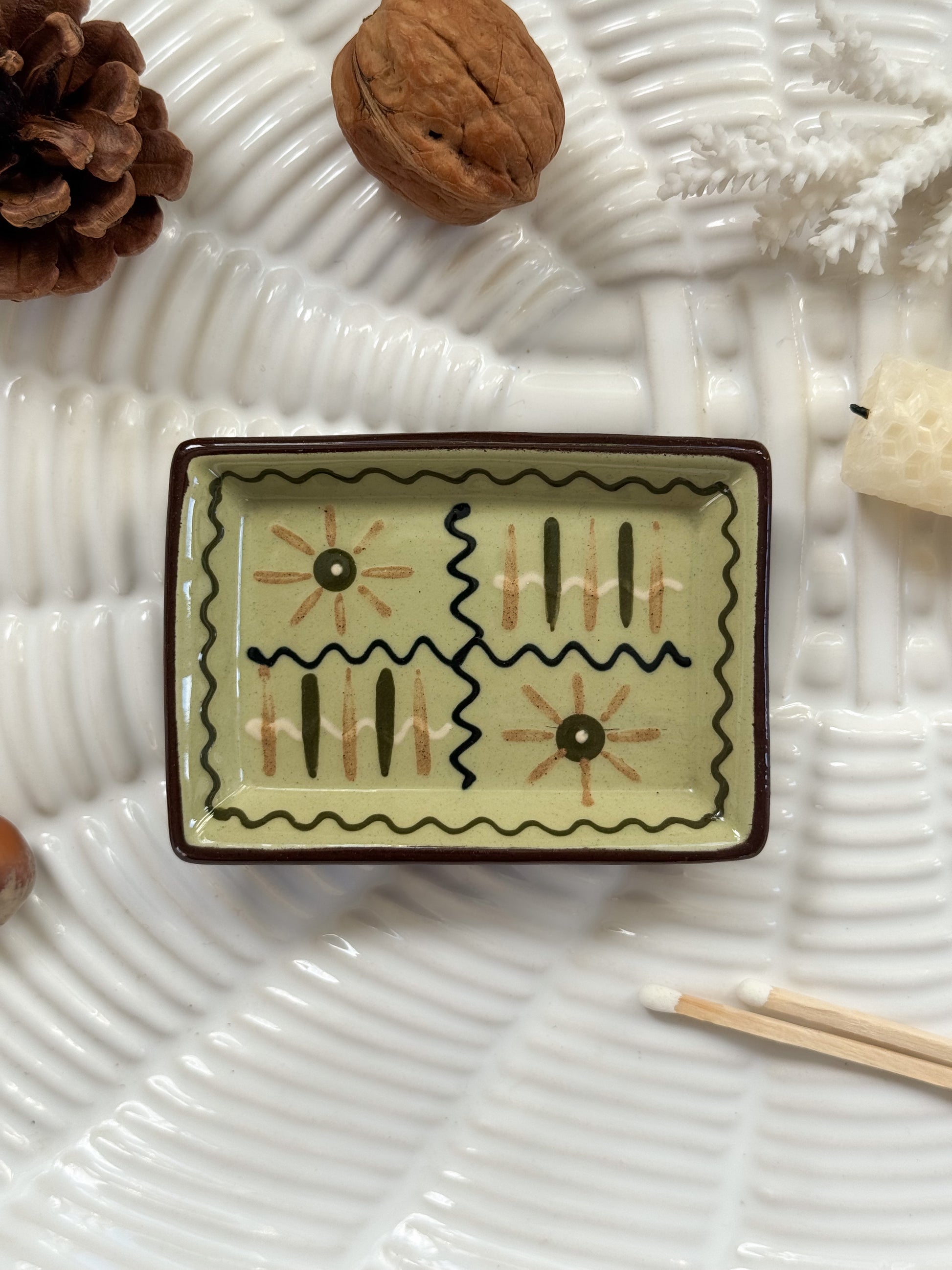A lovely little slipware trinket dish from Watcombe Pottery, Torquay, with bold hand-painted decoration in earthy greens, ochre, and deep brown. Its abstract design feels both rustic and modernist, making it a versatile piece to style and use in daily rituals.